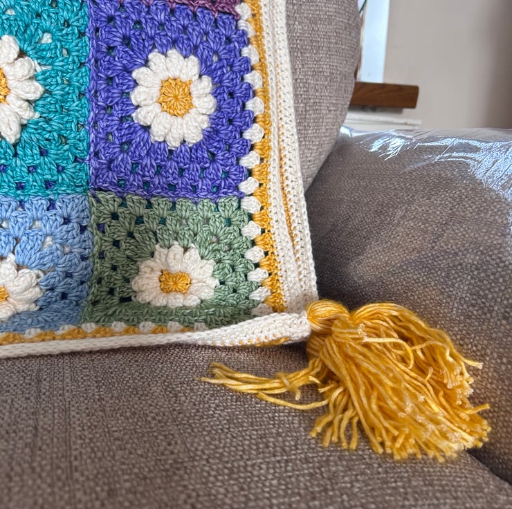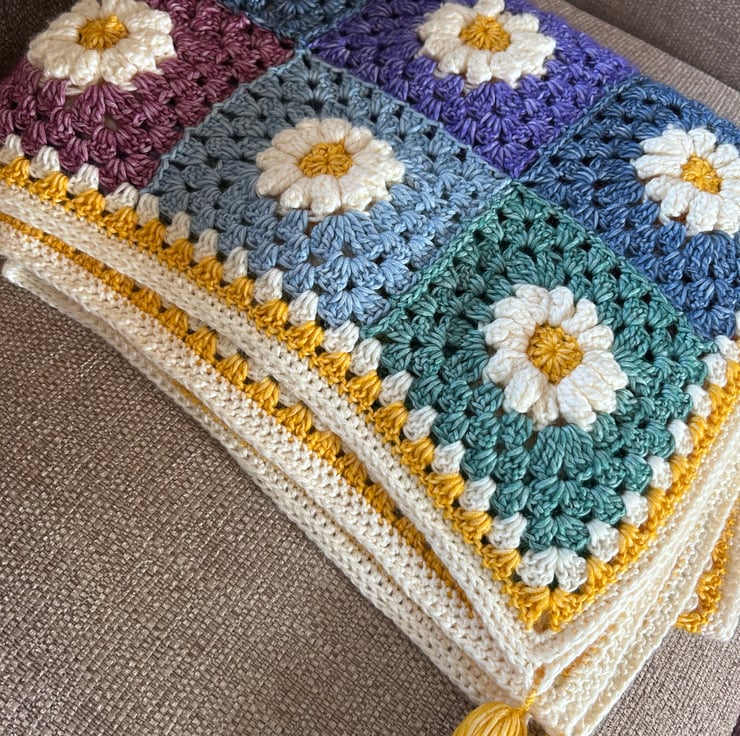 Wrap yourself in sunshine with this one-of-a-kind, hand-crocheted blanket! Made with soft, luxurious Pebble Haze yarn, this beauty bursts with colour in cheerful daisy-inspired squares, each one blooming with summer charm. A crisp white and yellow border frames the design, giving it a fresh, uplifting finish, while playful corner tassels add that perfect touch of whimsy.