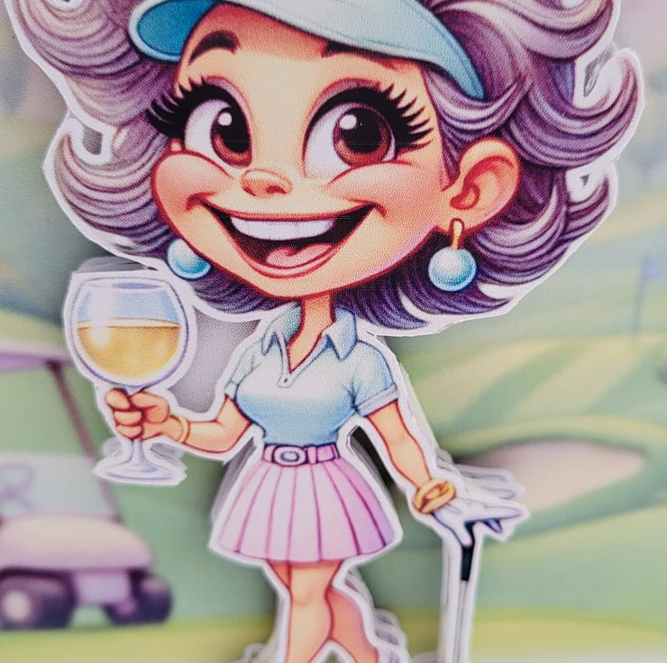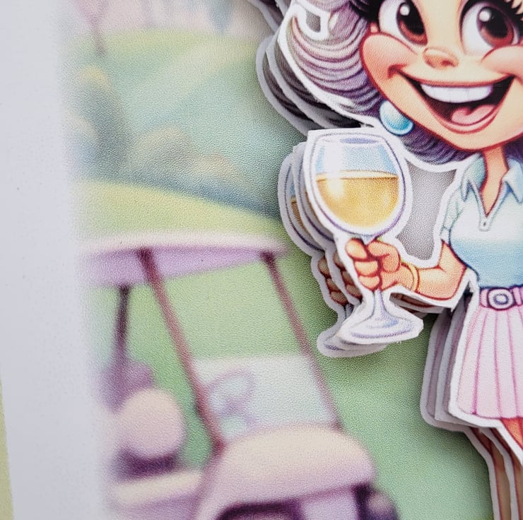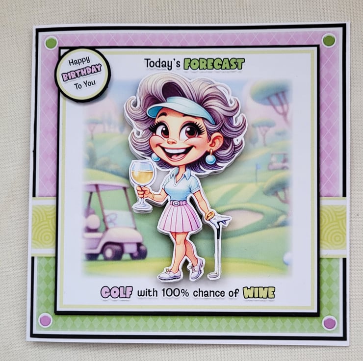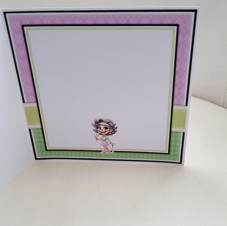 This lady golfer greeting card is a fun card to send to a golfer. I printed the image onto good quality pro print card and then hand cut each element and layered them up to create depth and dimension. The inside of the card has a blank insert that matches the front. The card measures 7x7 inches approx.