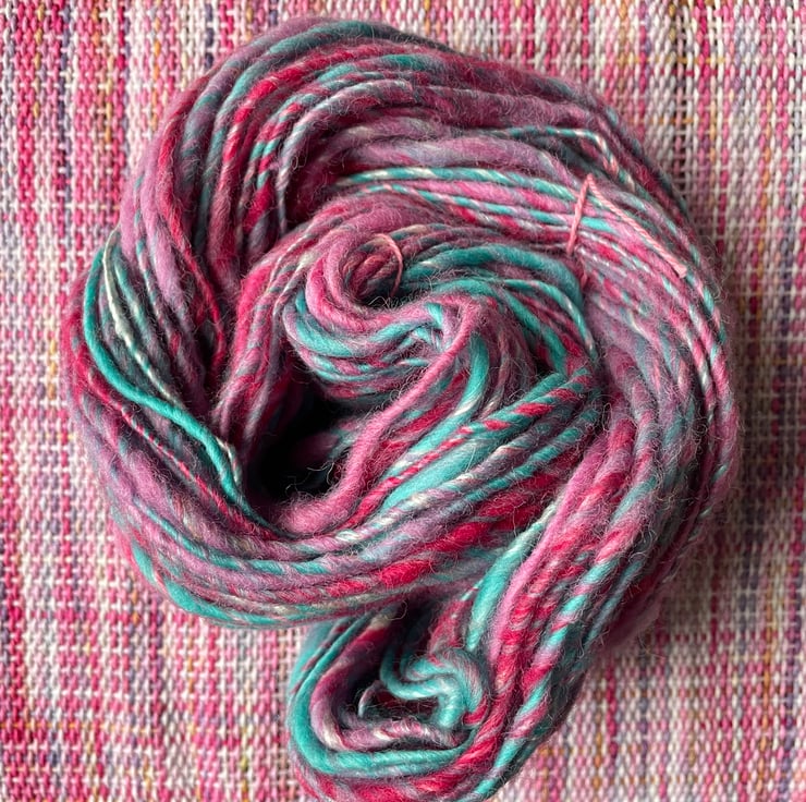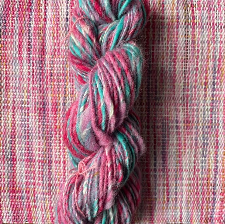 Colours are blended on a drum carder and then the yarn is spun on an Ashford traditional spinning wheel. All made by hand, this art yarn is perfect for your next project. That might be knitting, crochet, weaving, embroidery or felting! The only limit is your imagination!! If you're stuck for ideas, find me on Tiktok where I regularly post projects I have completed using my handspun yarn.