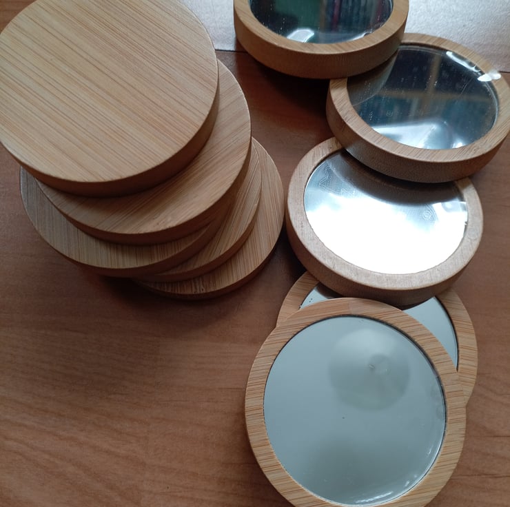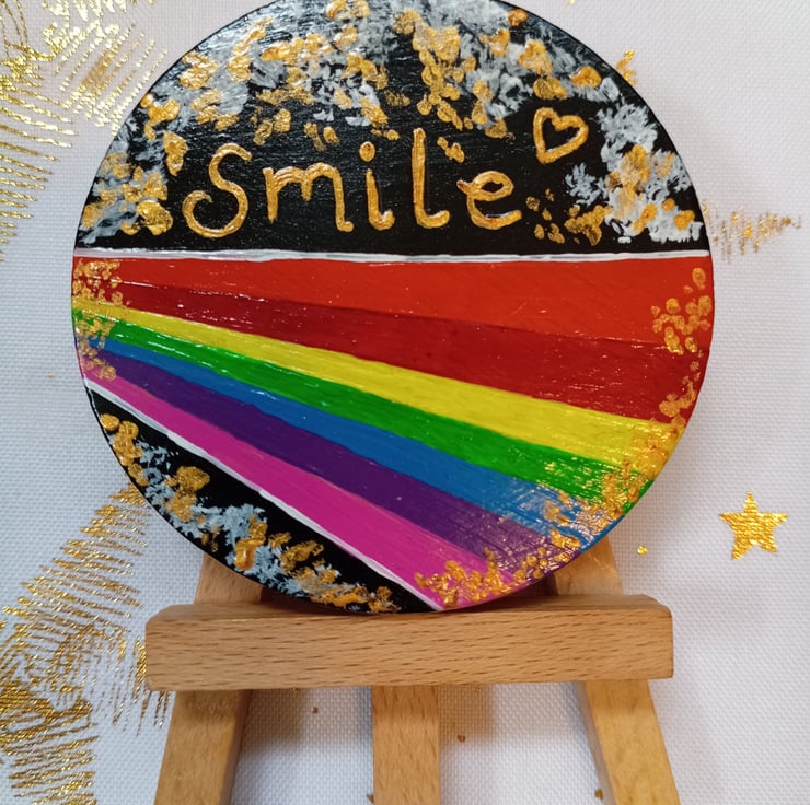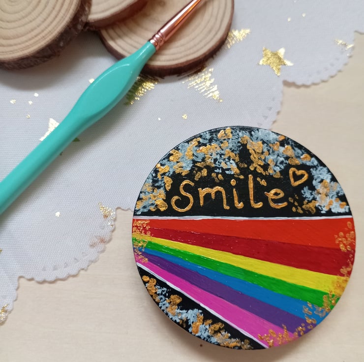 This rainbow is painted using acrylics onto a 7.2cm wooden pocket mirror and features the word smile