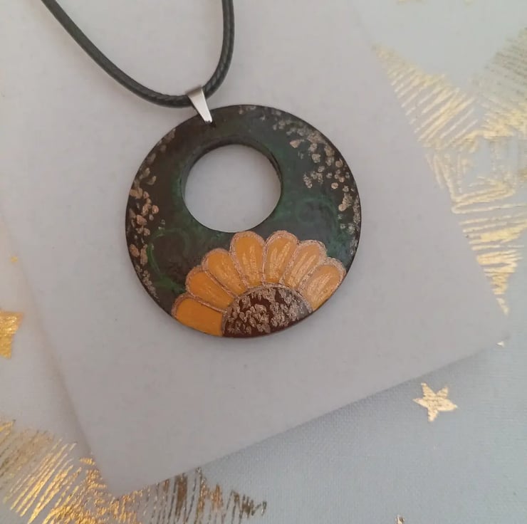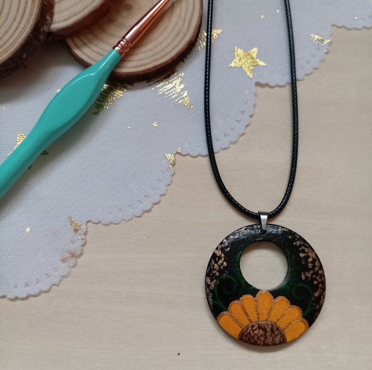 This sunflower has been painted onto a 4cm wooden circle pendant, it has green and gold detailing and a black background
