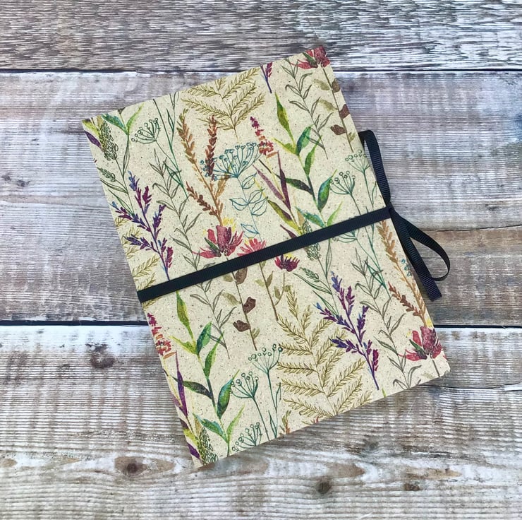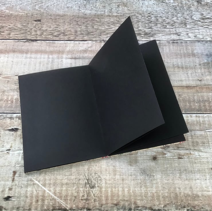 This concertina photo album has 12 panels of 270gsm black, acid free card and is covered with a beautiful, sustainable grass paper depicting wild summer flowers and grasses. It is tied with a black grosgrain ribbon which unties easily and can be used as a secure closure for transportation simply by retying.