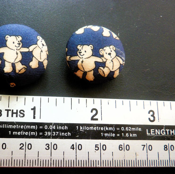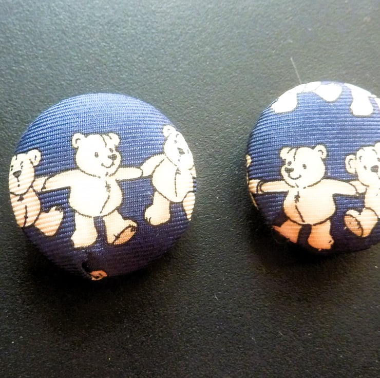 These are unique to me buttons so when they are all sold there can be no more. This design is of a chorus line of golden yellow dancing bears on a dark blue background.