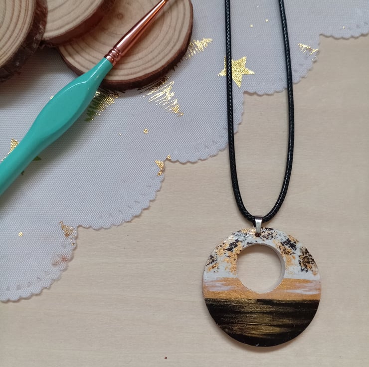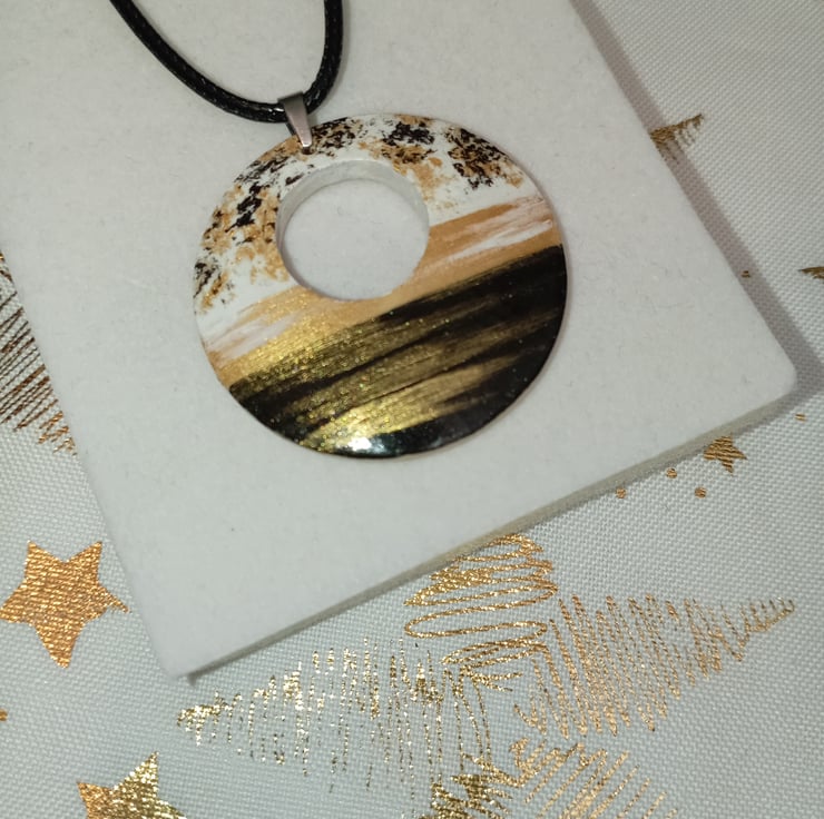 A 4cm wooden circle pendant painted in a gold, black and white sunset style.