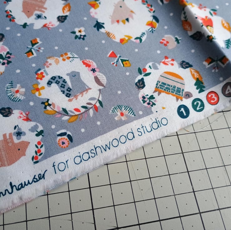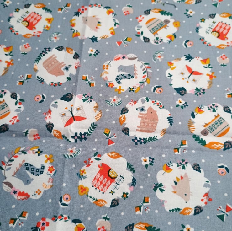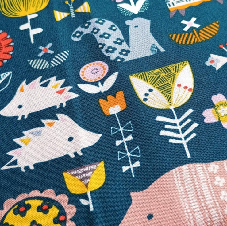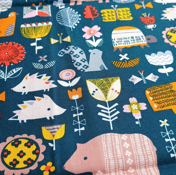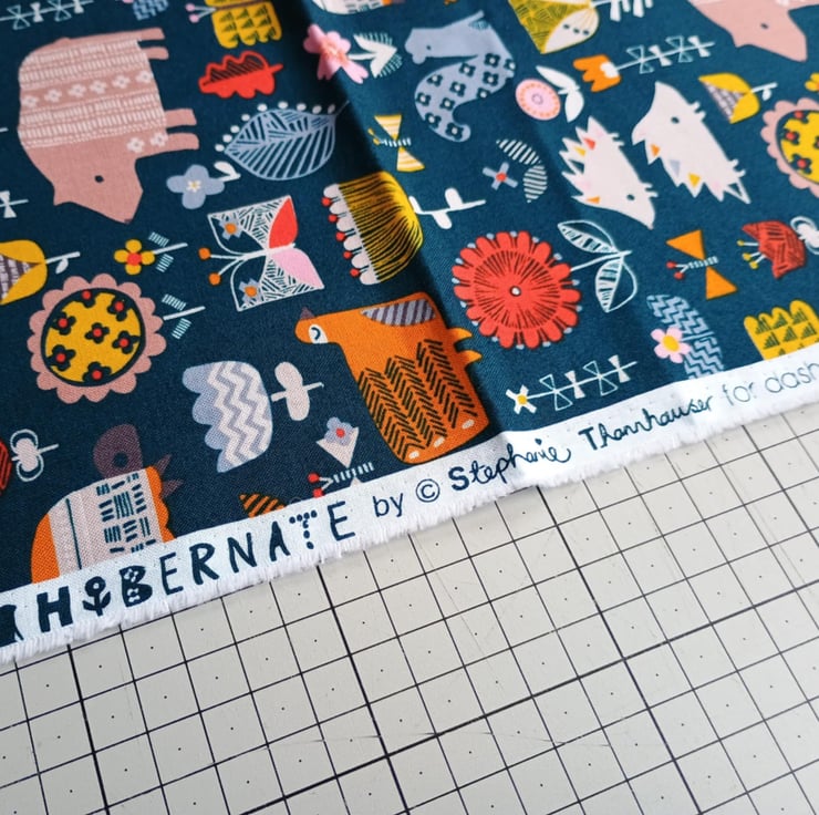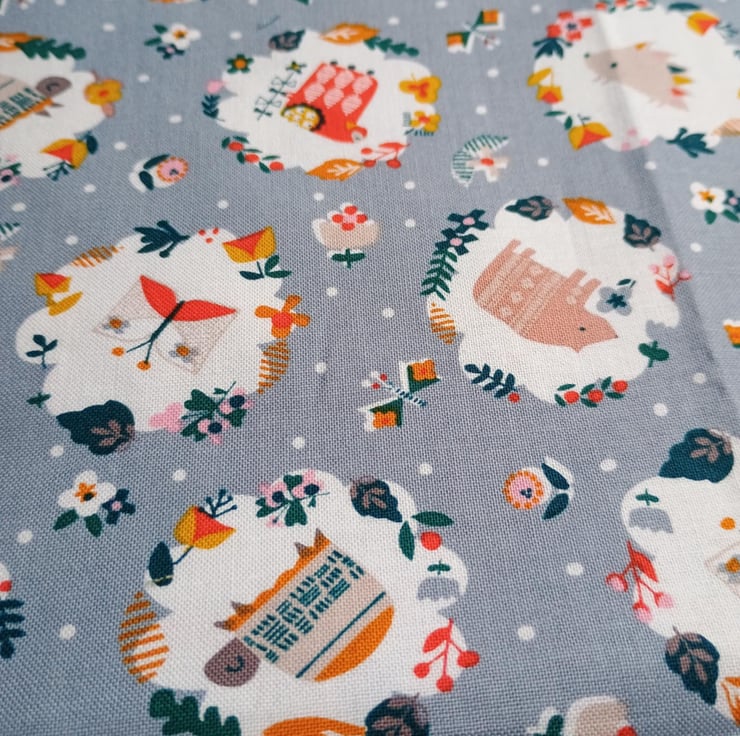 Two cotton fat quarters from the Hibernate range by the designer Stephanie Thannhauser for Dashwood Studios. A lovely quality cotton fabric, ideal for patchwork, home decor and general crafts. Lots of woodland animals, including hedgehogs, bears, quail, squirrels, butterflies and flowers.