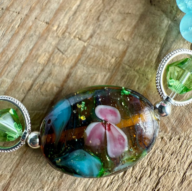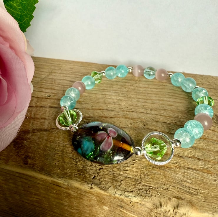 Unique handmade stretch beaded bracelet. For the central bead I've used a pretty dark green glass lamp work bead with a delicate flower design in tones of pink and blue with specks of gold. Either side of the bead is a stainless ring containing a delicate green crystal bicone bead.The rest of the bracelet is made up of pastel blue crackled effect glass beads and pastel pink cat eye glass beads, stainless steel spacers and two other green bicone beads. If you love pastel colours you'll love this bracelet.