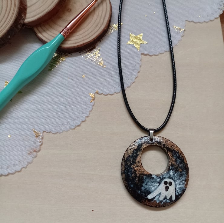 A 4cm wooden circular pendant hand painted in a ghost design, features a black and gold background