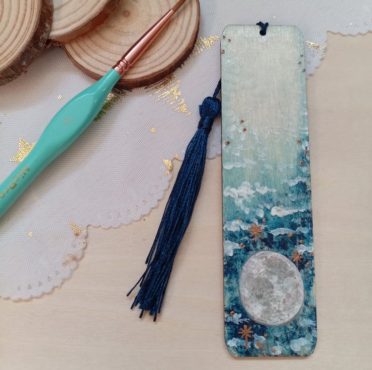 A wooden bookmark hand painted with a full moon design featuring a blue sky background