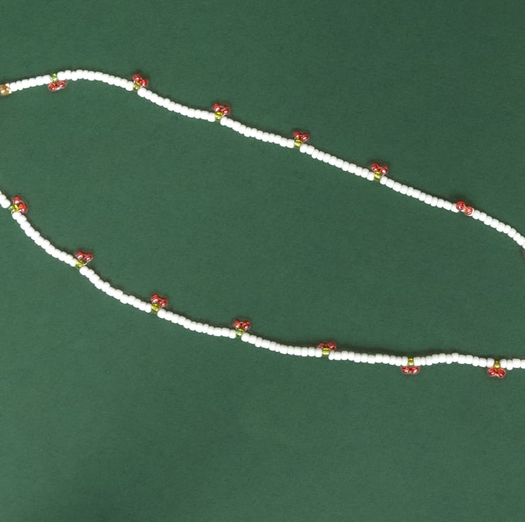 Each necklace is carefully beaded with tiny 3mm glass seed beads in a pearly red and white colour, finished with a gold-plated clasp and extender chain.