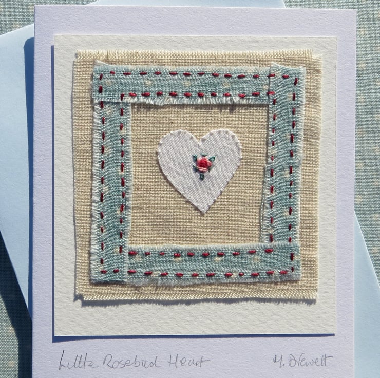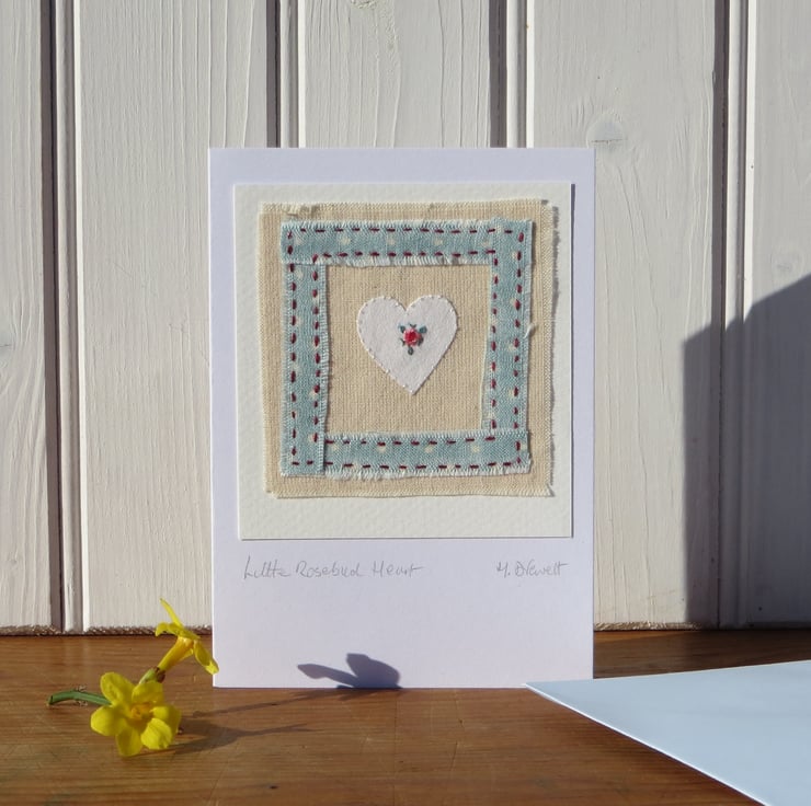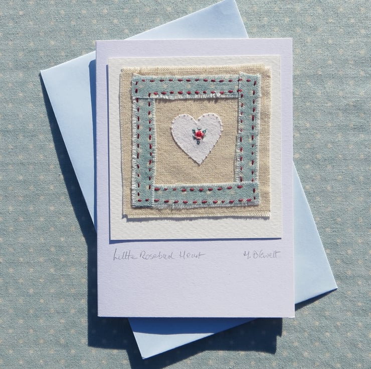 A hand-stitched miniature applique heart with embroidered rosebud in the centre. The heart is bordered by pretty polka dot fabric, stitched into place with tiny stitches. Delicate hand-embroidery, perfect for any number of occasions: new baby, first birthday, engagement, Mother's Day, wedding or anniversary.....! Definitely a card to keep.