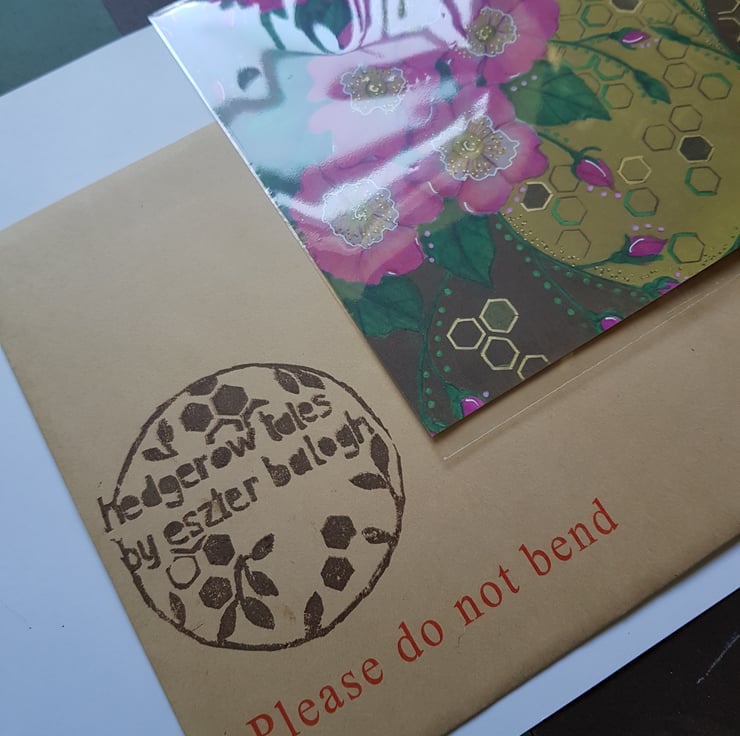 Professionally printed art print of one of my mixed media illustrations. It was printed in UK on 350gsm recycled paper. After printing, I re-traced the golden details of the honeycomb design and of the pollen at the roses' centres in order to preserve their shine.