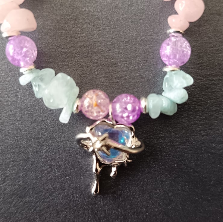 This handmade bracelet is crafted with magic stretch elastic, crystal chip pastel blue and pink beads, lilac beads, silver decorative spacers and featuring a silver and pink-purple glass heart and star charm. This piece measures 7 inches