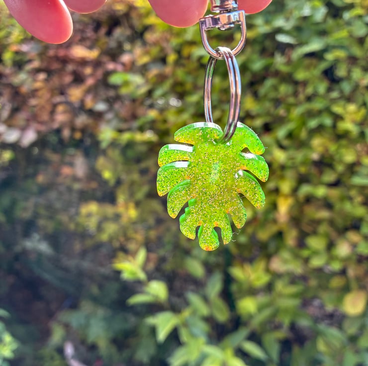 Green dye in epoxy resin monstera leaf with a tiny sprinkle of glitter. Key ring silver tone metal added.