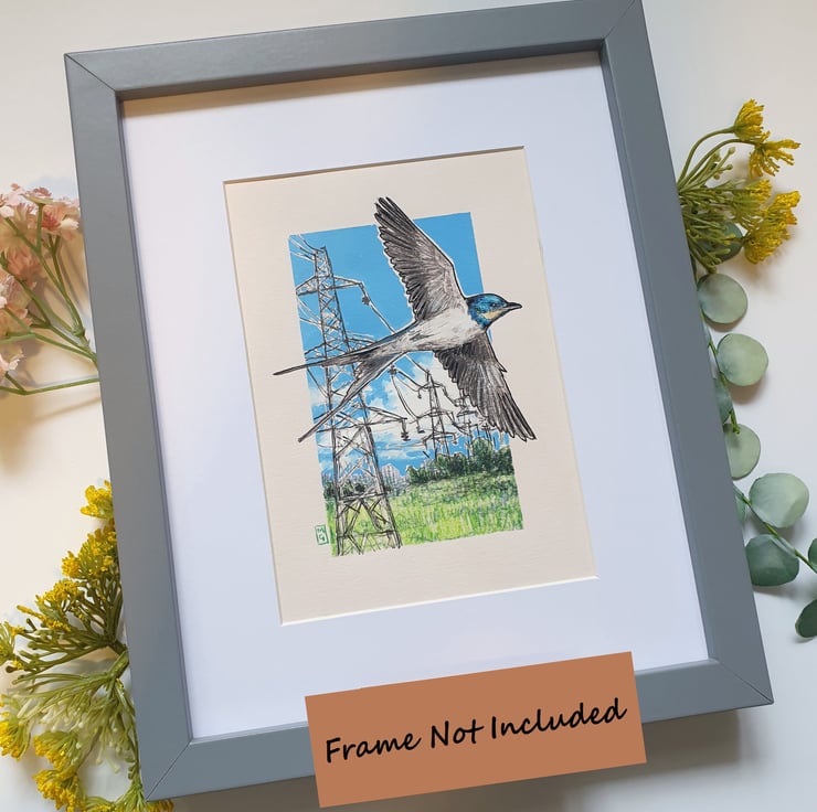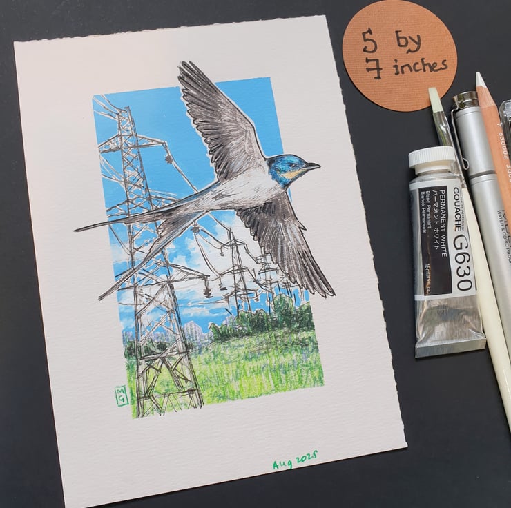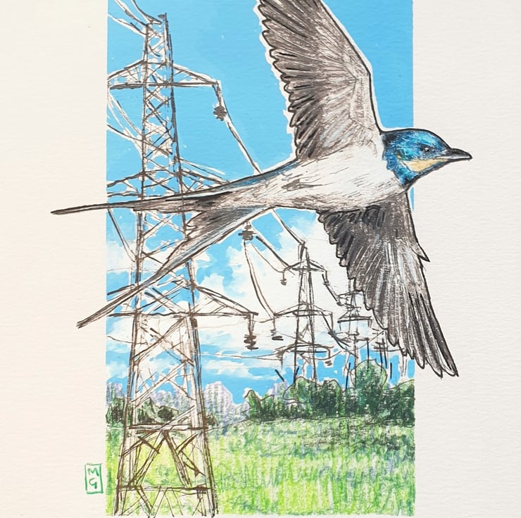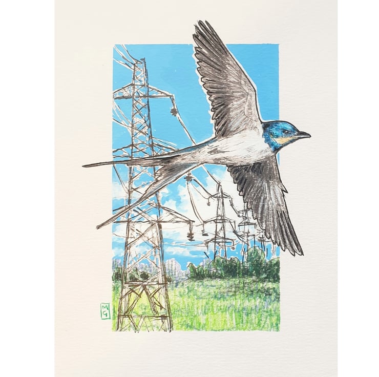 A small drawing of a swallow in flight with a background of a landscape with a field and electricity pylons. The drawing is on slightly off white paper.