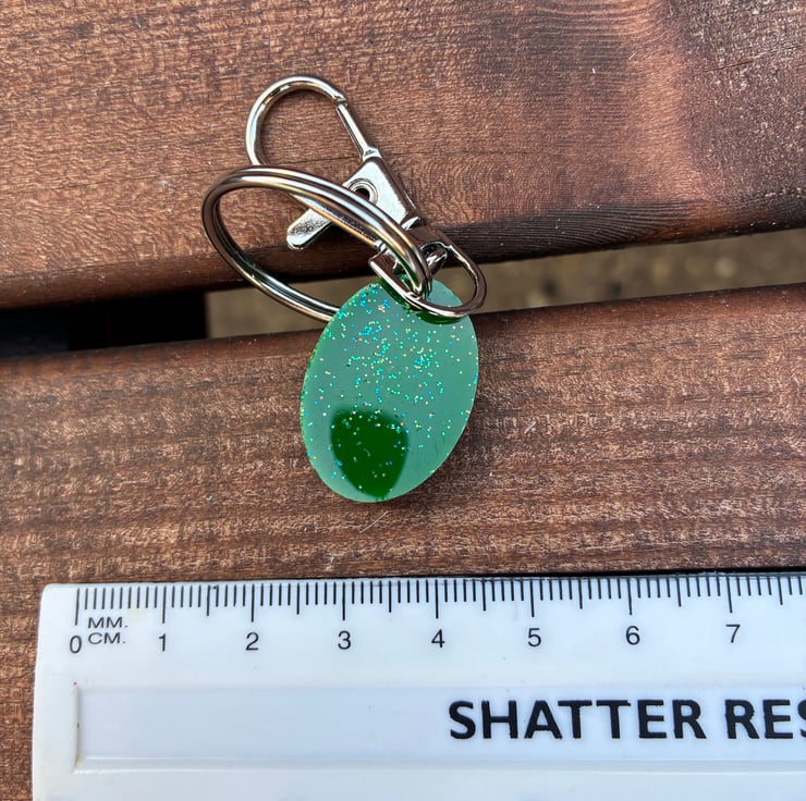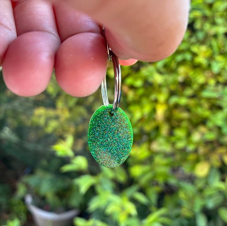 Epoxy resin, ink and a mix of tiny blue and green glitter. Unique piece.