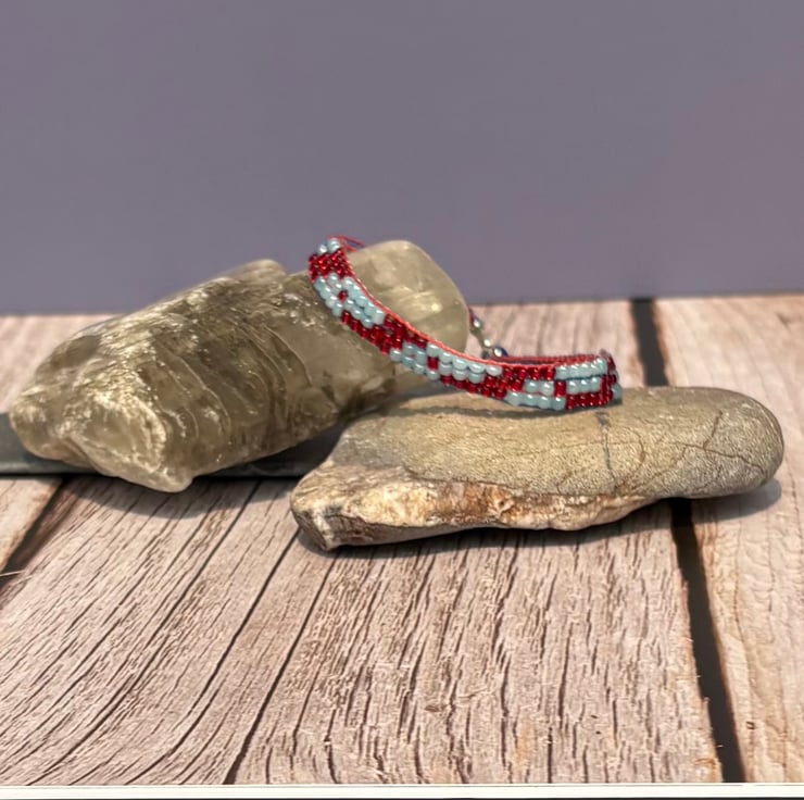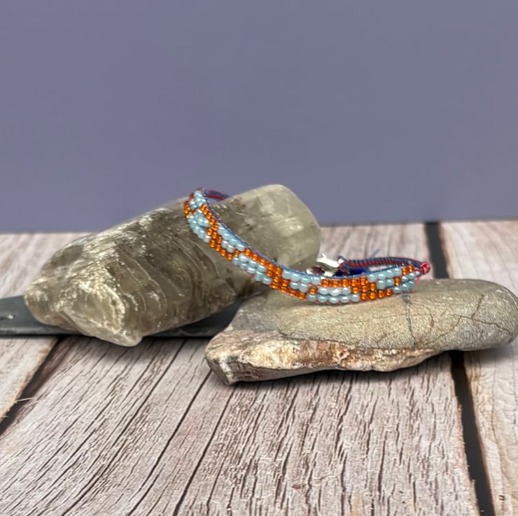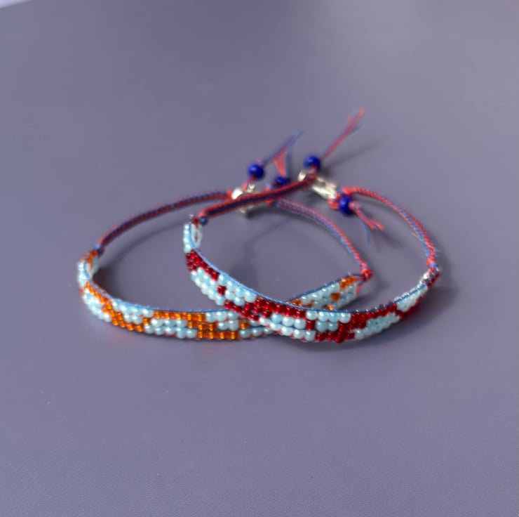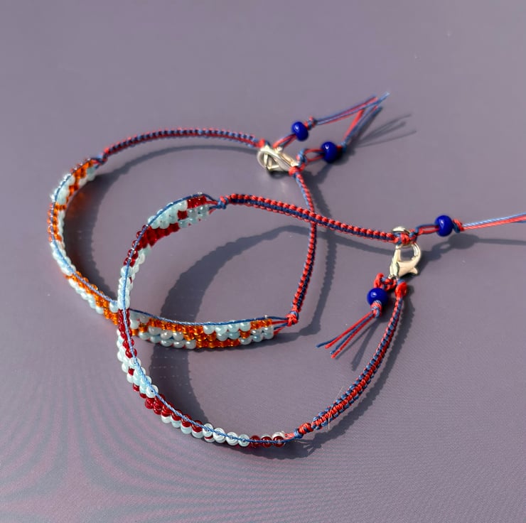 These striking bracelets are hand woven on a bead loom with 3 rows of glass seed beads creating a colourful pattern. The waxed thread warp strings have been braided at each end using a square knot macrame technique and fastened with a lobster claw clasp and ring.