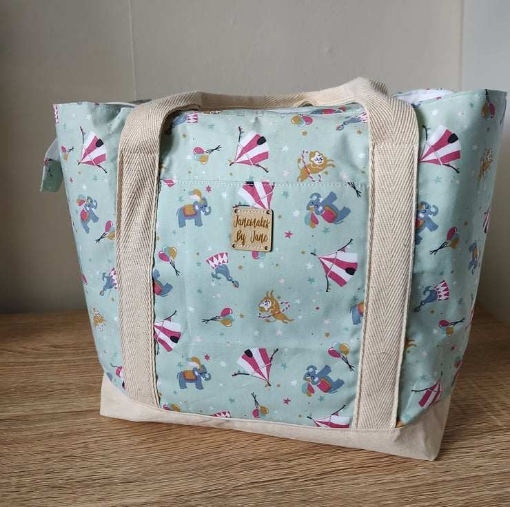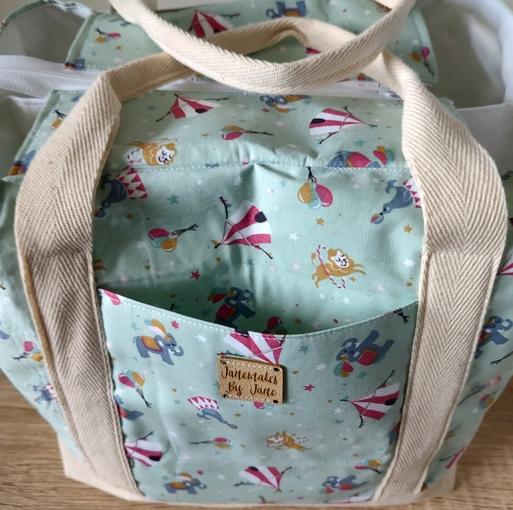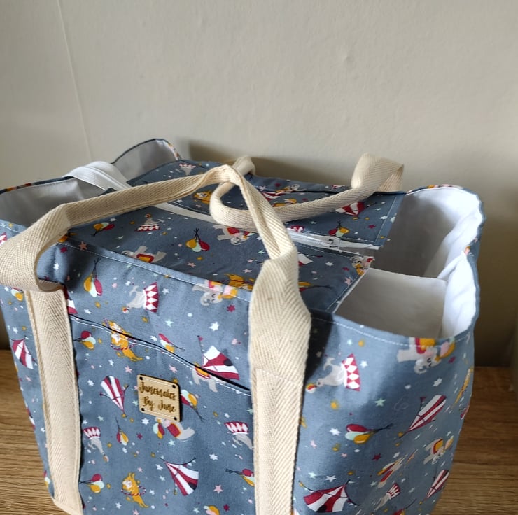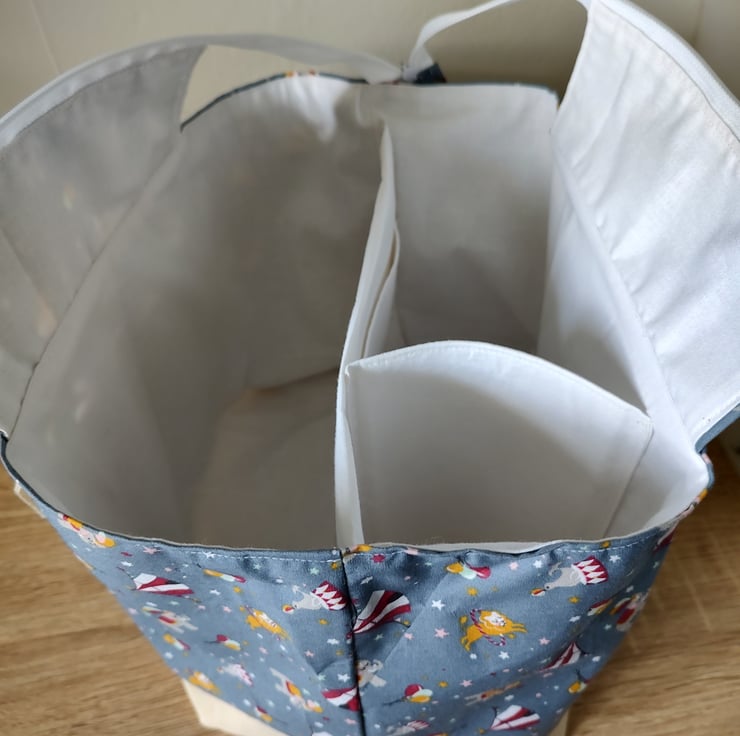 Stylish and practical Nappy Bag Organiser, in a Circus print fabric, in blue grey and mint green. Only one of each colour. Each bag has three compartments, and are the perfect size for storing essential baby items. With carry handles for ease of movement around the home, or out and about. Would also make a lovely baby shower gift.