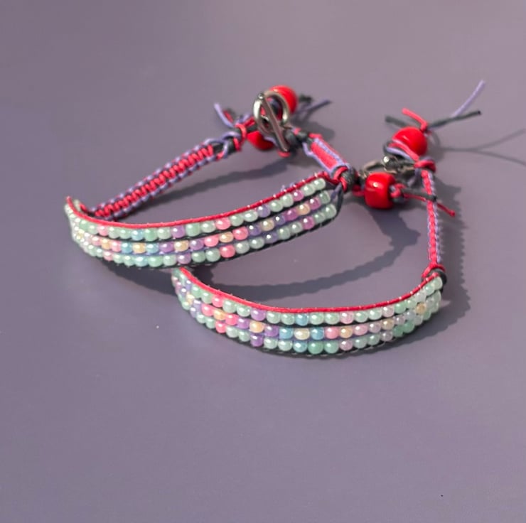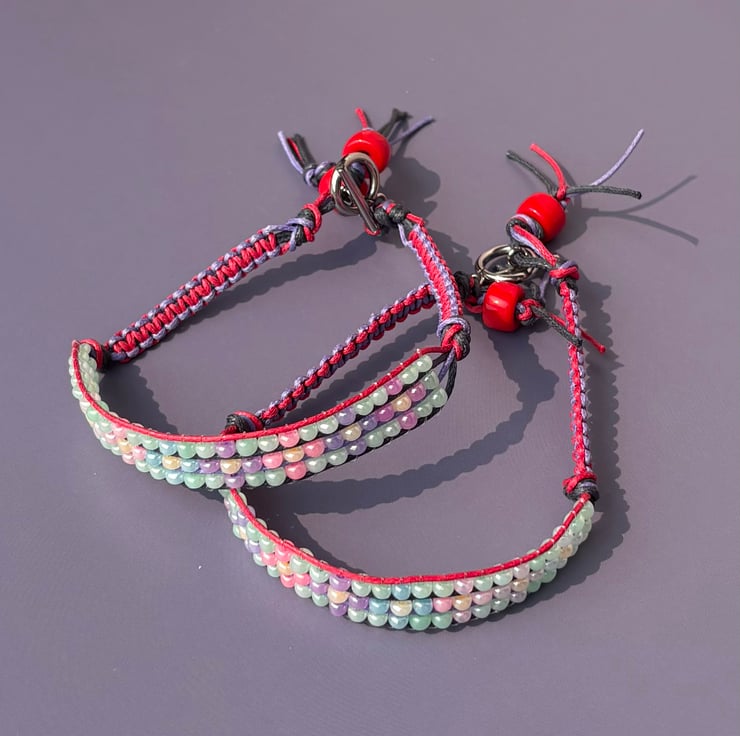 These pretty bracelets are hand woven on a bead loom with 3 rows of glass seed beads creating a colourful pattern. The waxed thread warp strings have been braided at each end using a square knot macrame technique and fastened with a ring and bar clasp.