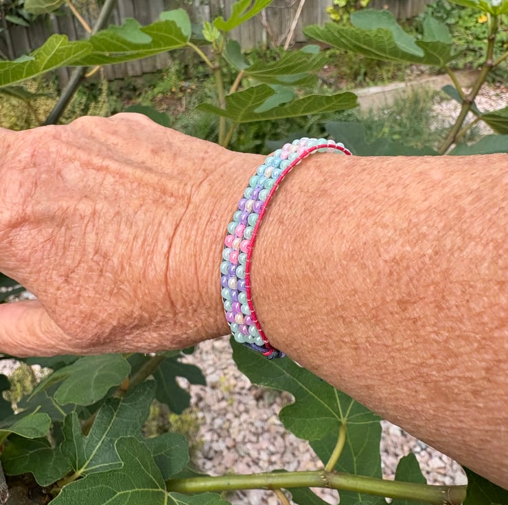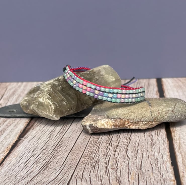 I have used large seed beads and thicker waxed thread to make these bracelets giving them a chunky feel which contrasts nicely with the pastel colour palette