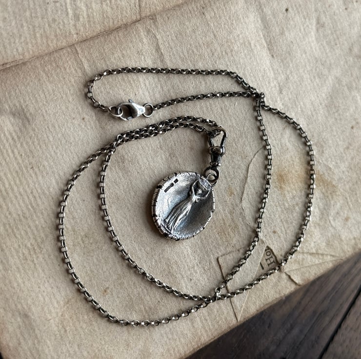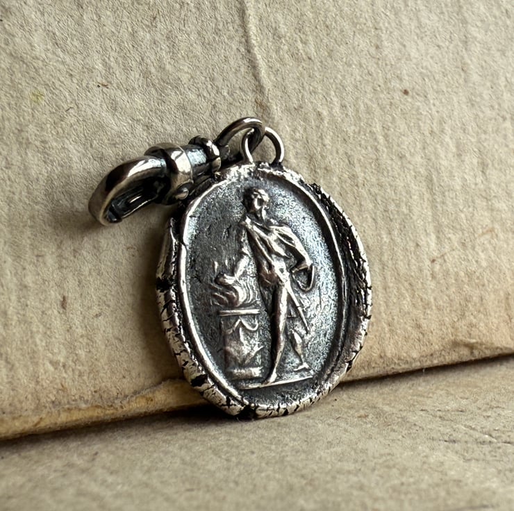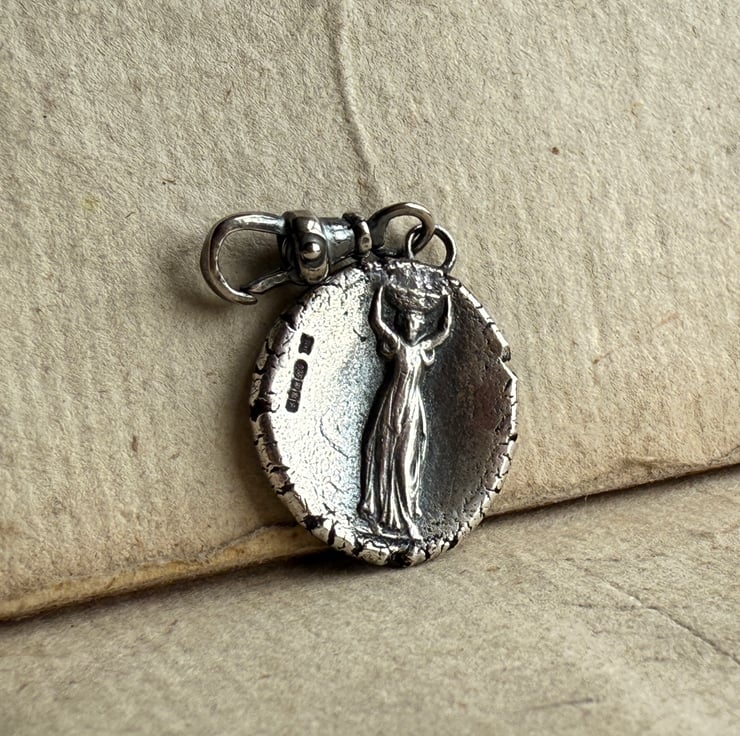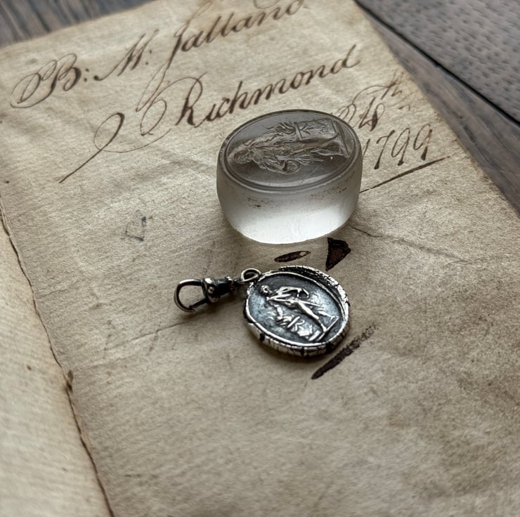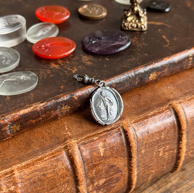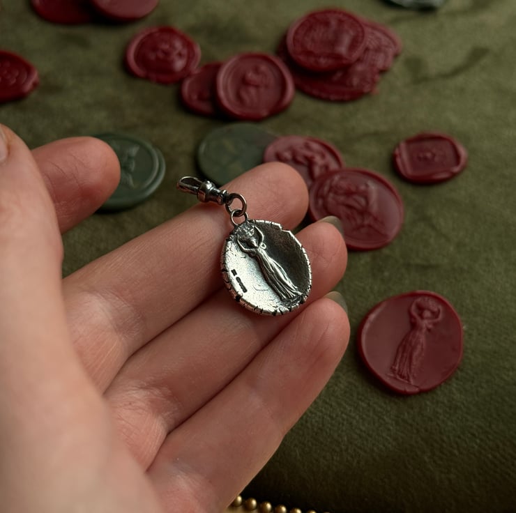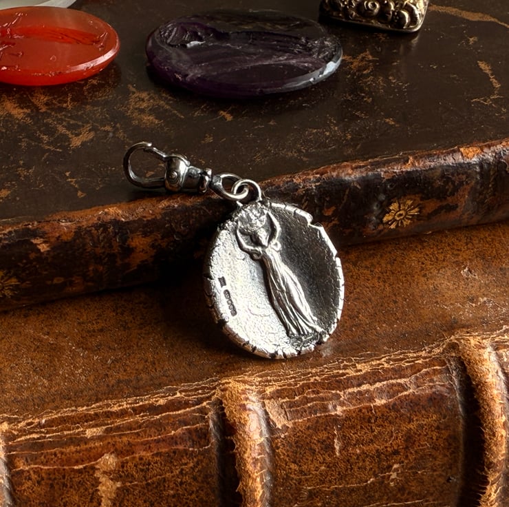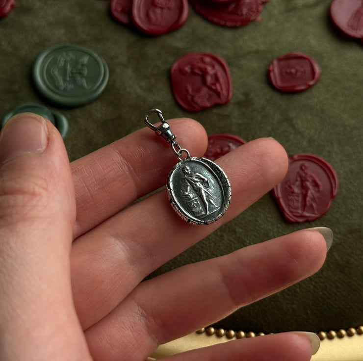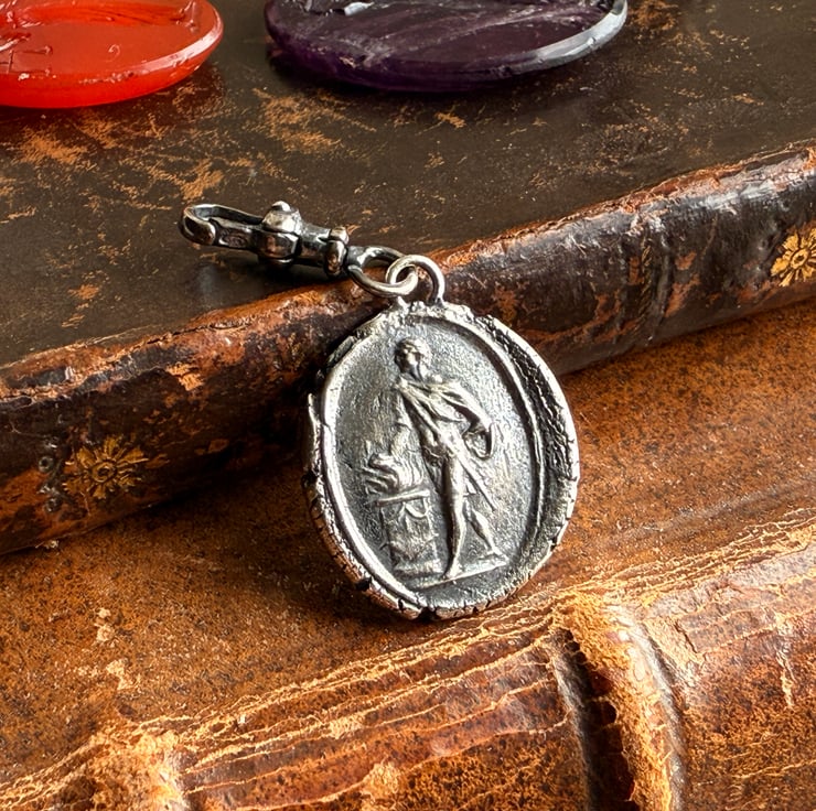 A double sided clip-on wax seal pendant/charm. Made from the impressions of two antique intaglios from Alex's beloved collection, featuring two classical Roman figures. It is made in recycled sterling silver.