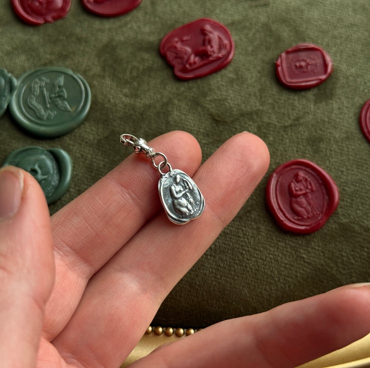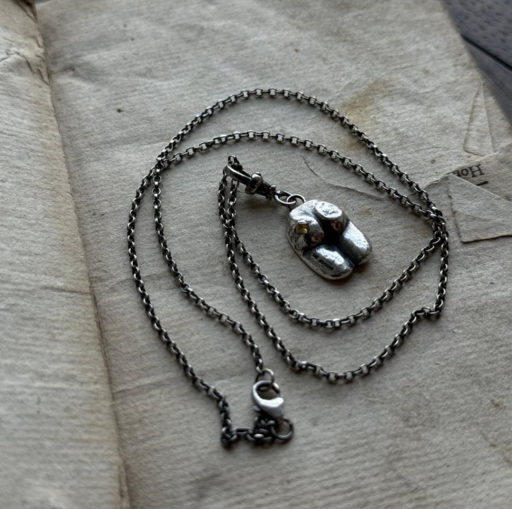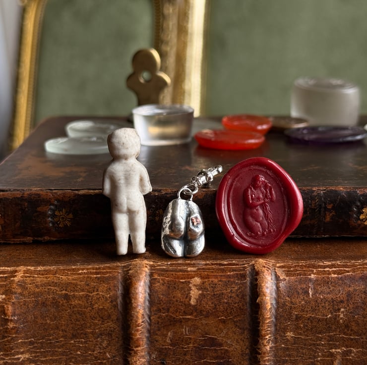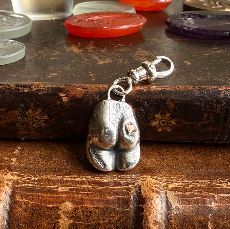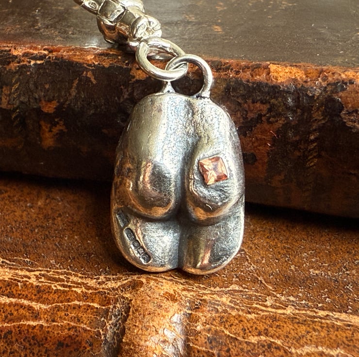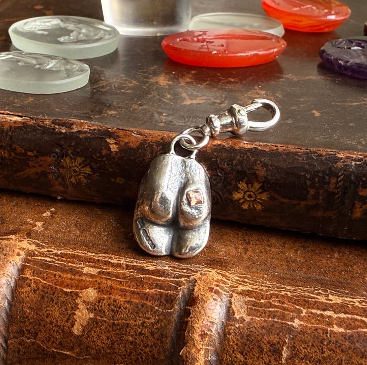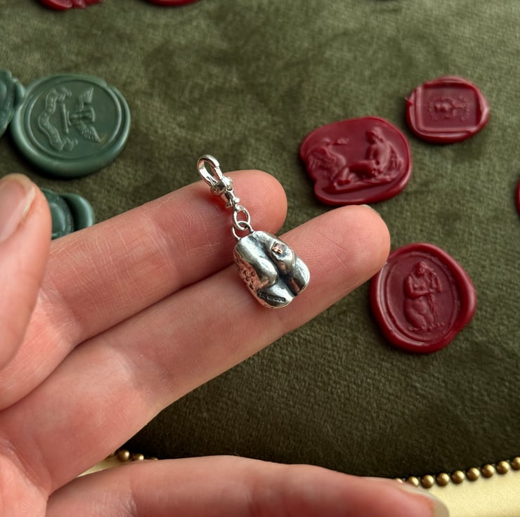 A double sided clip-on pendant/charm. Made from the impressions of an antique porcelain dolls bottom found during our mudlarking adventures and the impression of an 18th century intaglio seal on the reverse. It also features a natural peach sapphire embedded in the cheek. Is made in recycled sterling silver.