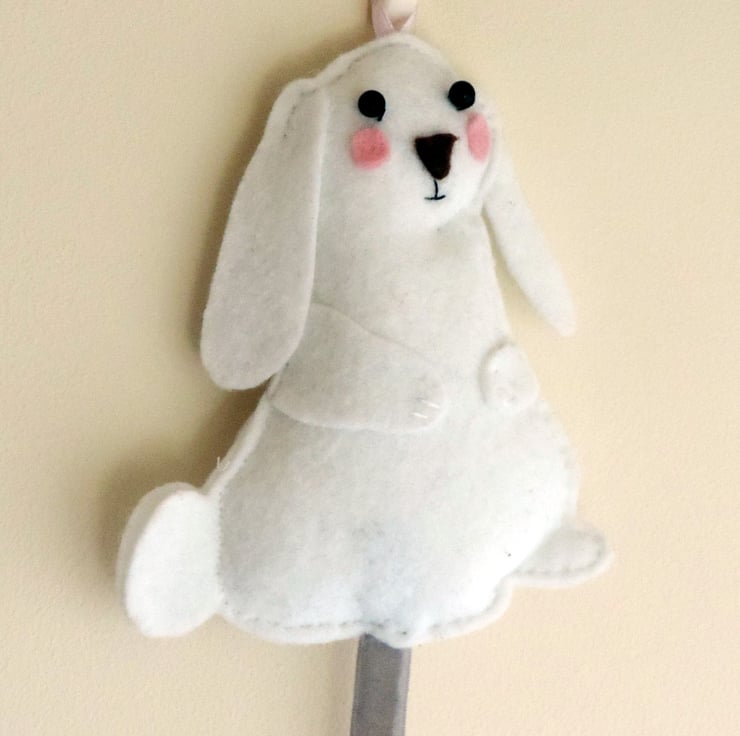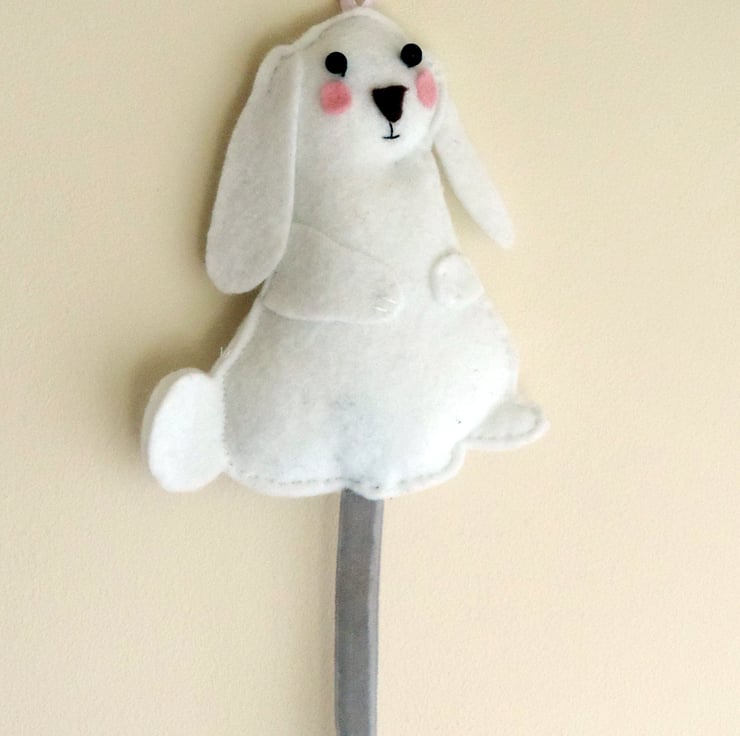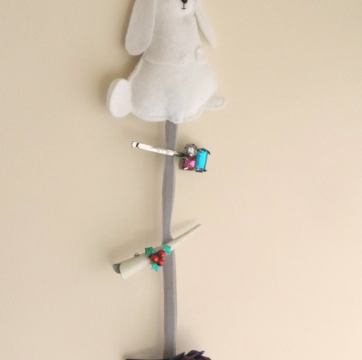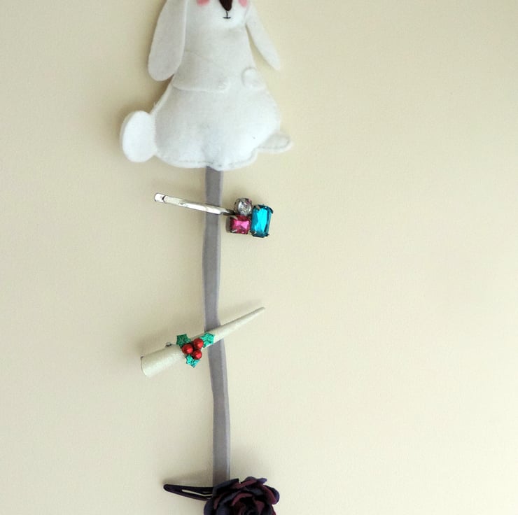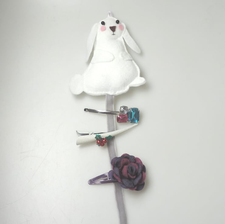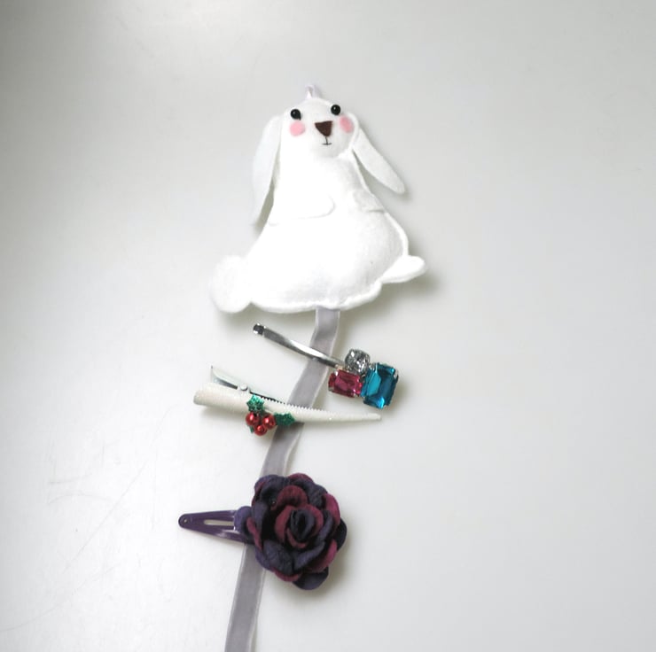 Hanging loop at the top of a cute white bunny rabbit, with pink cheeks and cottontail with a Silver/grey velvet ribbon hanging from the bottom. You use it to clip your hair accessories to.