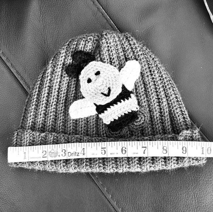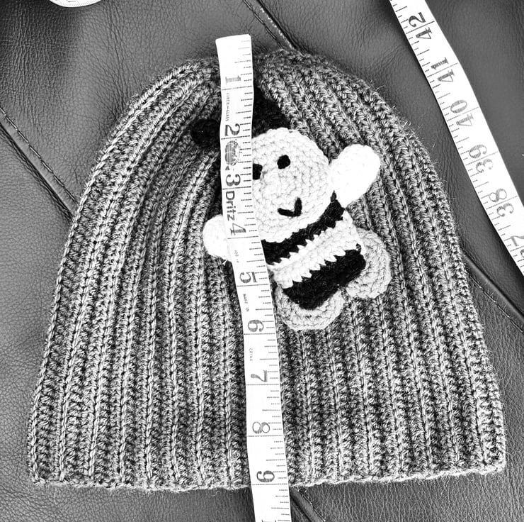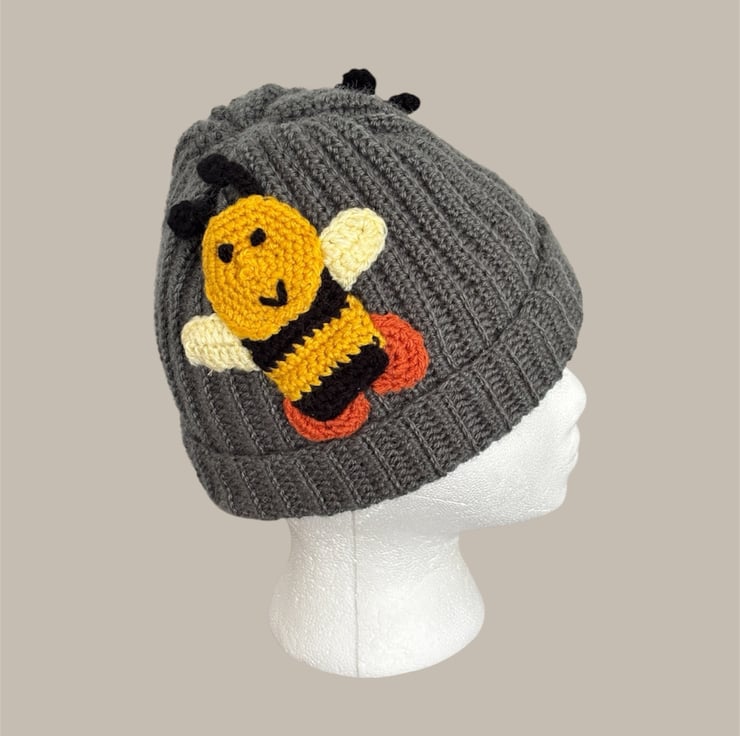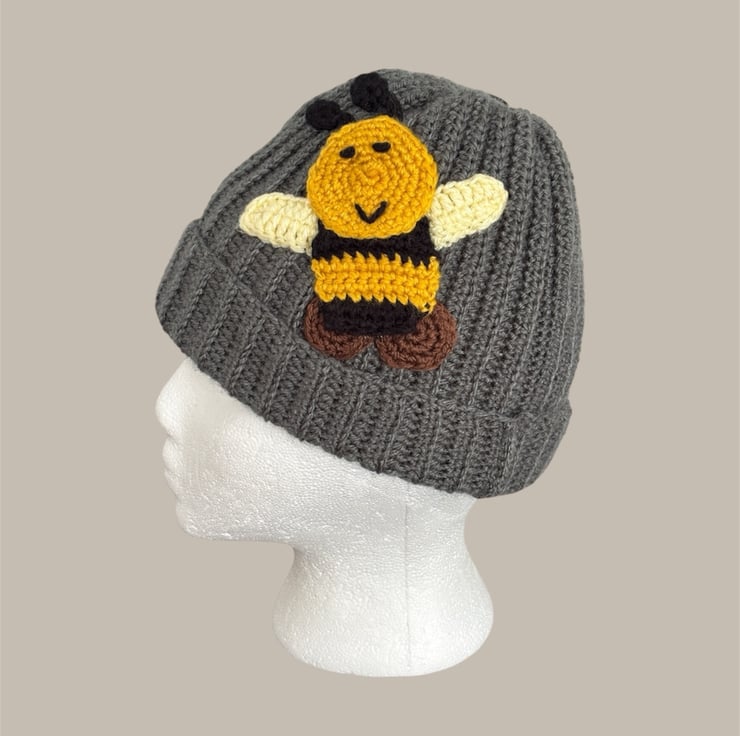 Steel grey crochet fun bee appliqué hat. Unisex. One size. Handmade.