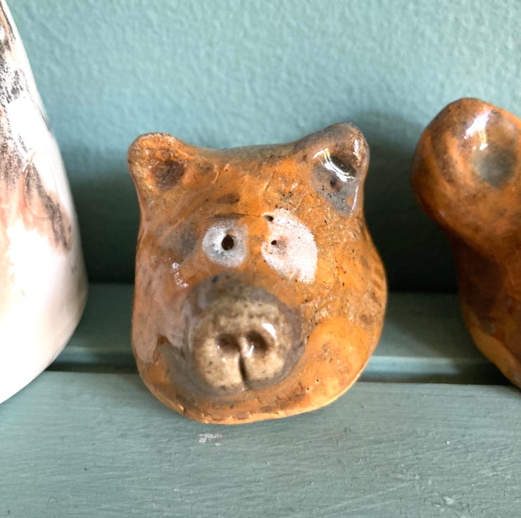 'Mummy Bear.' A ceramic bear animal head hand made and hand painted by me. It will make a lovely addition to a mantelpiece, to an eclectic shelf, a quirky paperweight or a desk buddy.