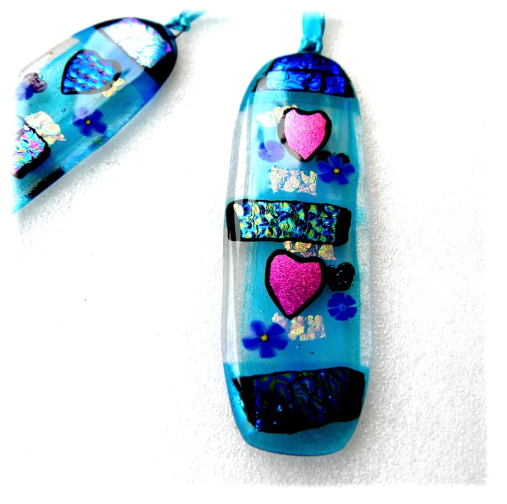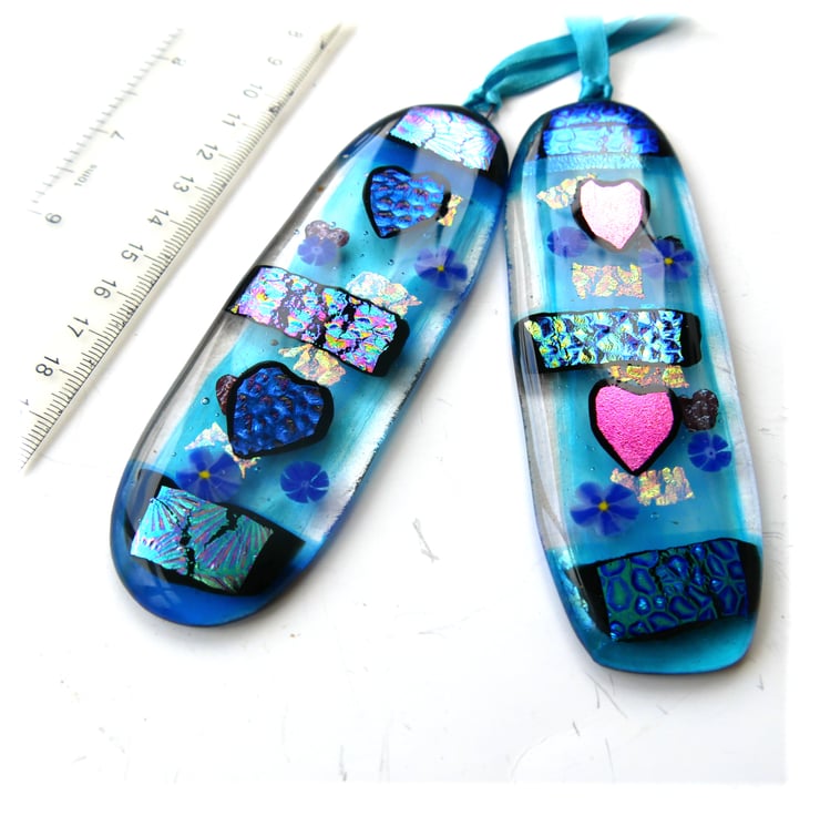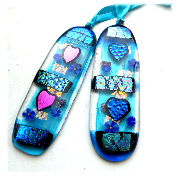 One has Pink Hearts, the other Blue Hearts cut from dichroic glass. Please add a note if you have a preference, but please note I have only one of each colour and cannot replicate.