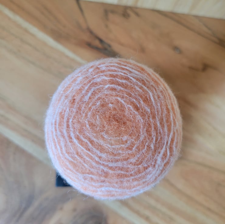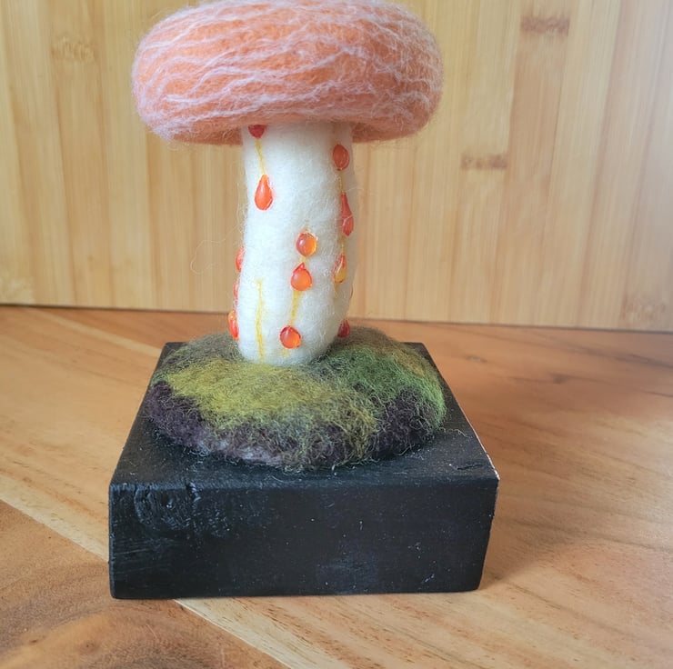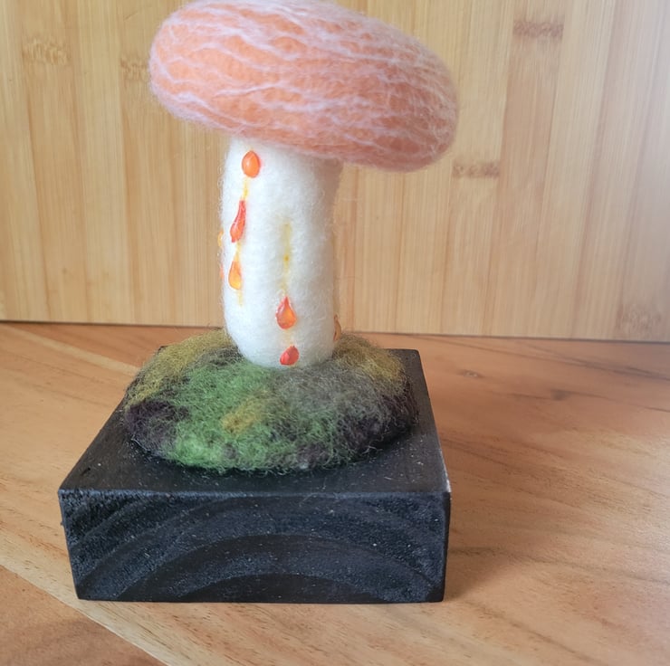 A needle felted wrinkled peach mushroom made from correidale & maori wool mounted on a wooden base (made from recycled wood)