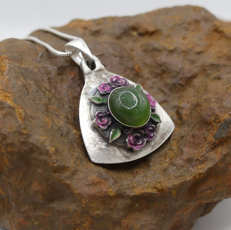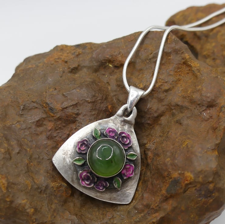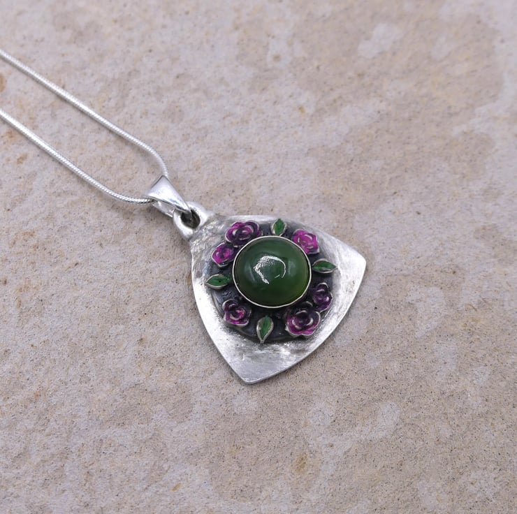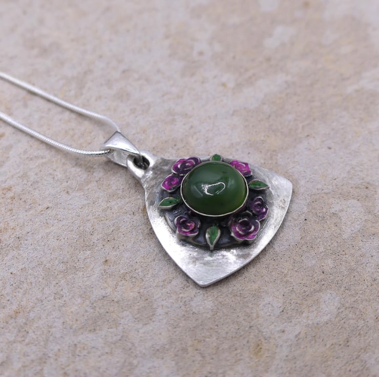 Sterling Silver Shield of Roses Pendant with Nephrite Jade Gemstone Necklace.