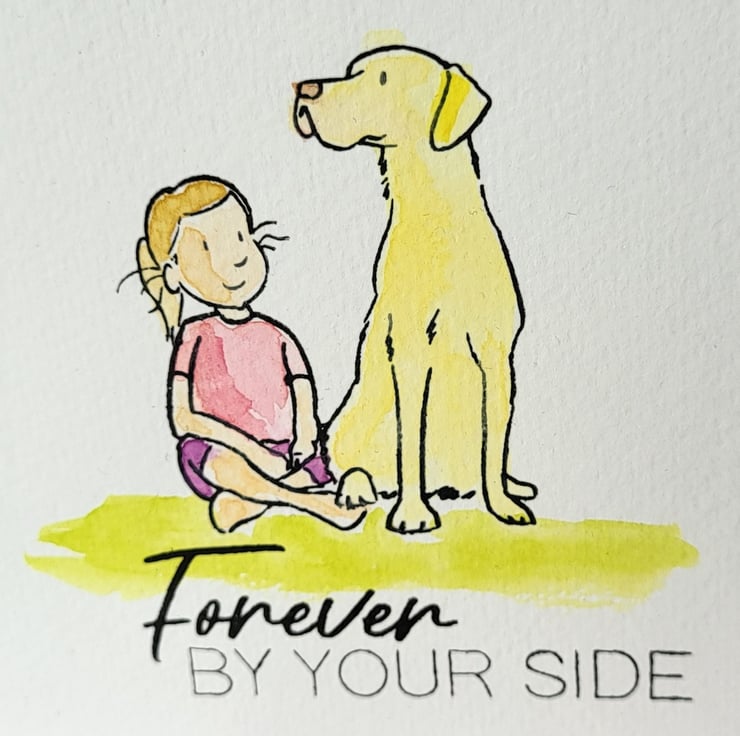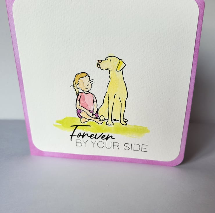 Sometimes we need to send a card just because. This card measures 6 x 6 approx. I have handstamped the little girl and the dog then watercoloured them in. I can do different colours to suit your recipient. I then handstamped the sentiment " Forever by your side "