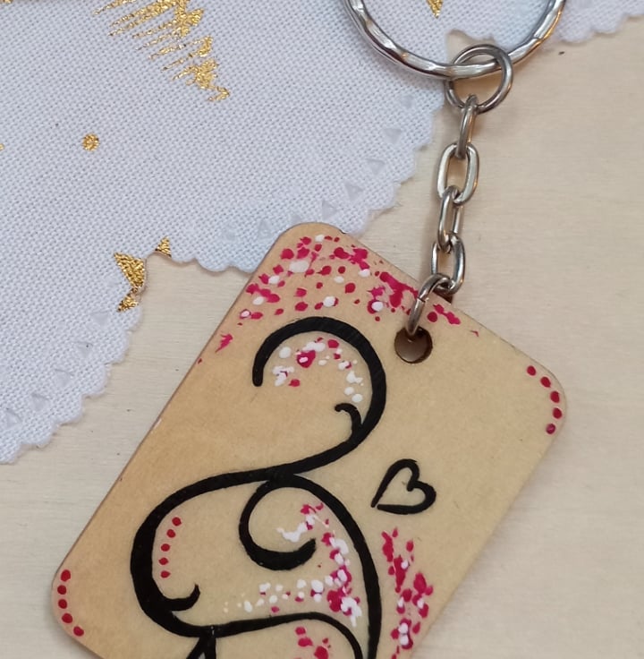 A 3cm x 4cm wooden rectangular keyring with a hand painted flamingo in a line drawn style featuring pink and white details and a small heart