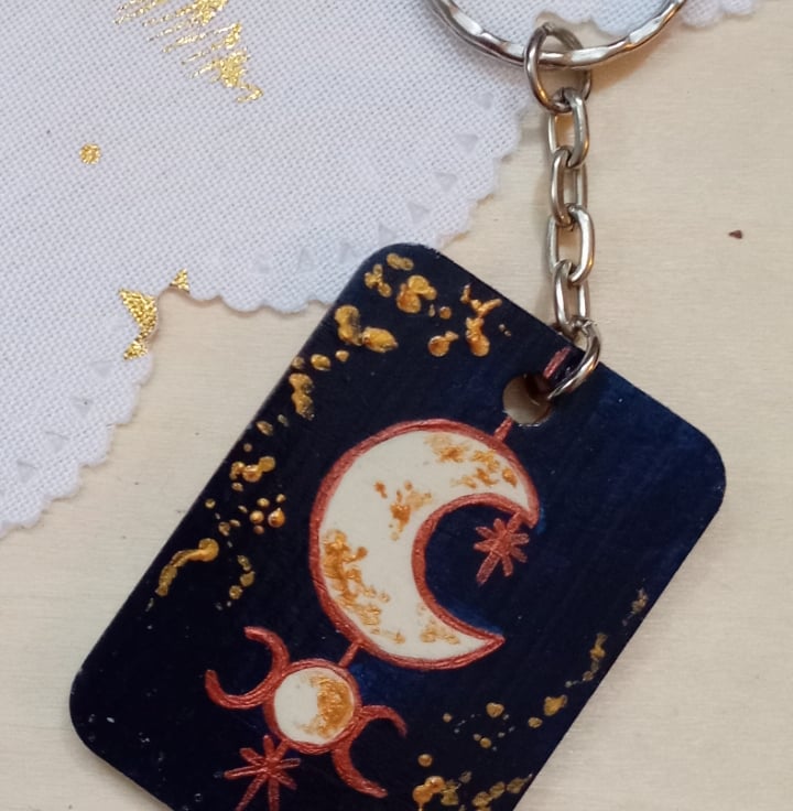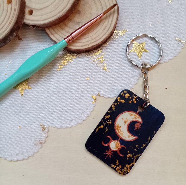 A 3cm x 4cm wooden rectangular keyring with a hand painted celestial moon design in a Dreamcatcher style and a deep dark blue background