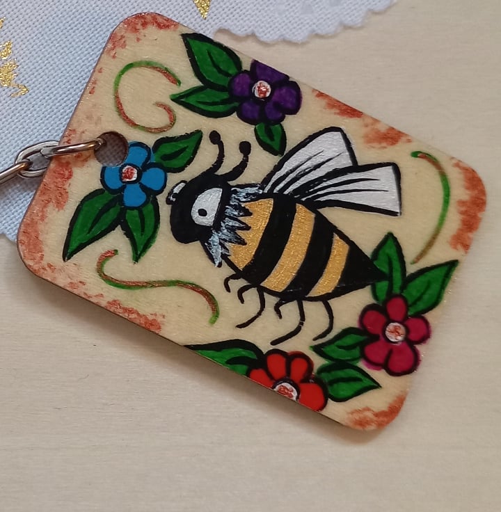 A 3cm x 4cm wooden rectangular keyring with a hand painted bee design featuring colourful flowers and green leaves