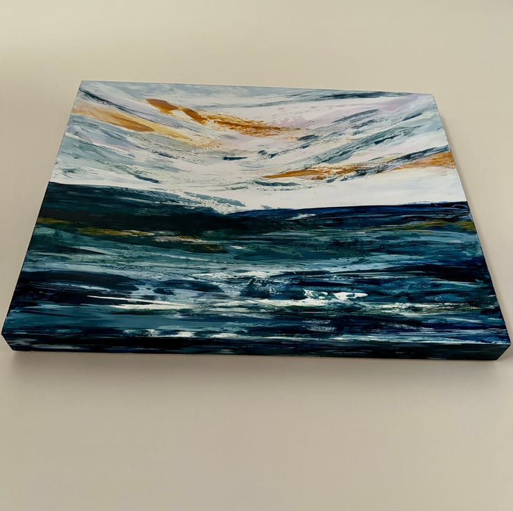 16” x 20” (40cm x 50cm) cradled wooden panel original acrylic seascape art. Depth of panel is 3.8cm/1.49". Signed on the back.