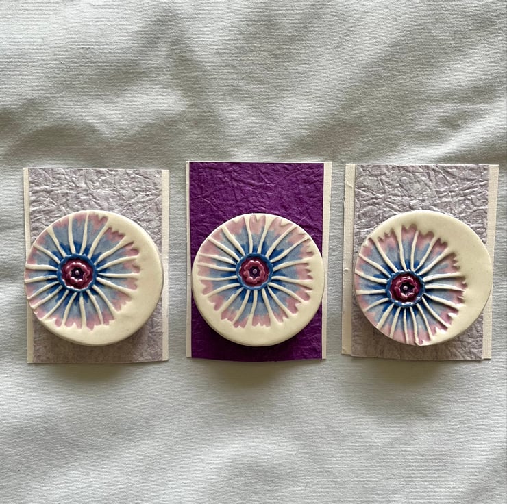 Made from white earthenware clay, these textured brooches are handmade from start to finish. Initially texture is applied to the surface of the clay using a decorative wooden block with a cornflower design. Each piece is then air dried for several days before being kiln fired to form bisqueware.