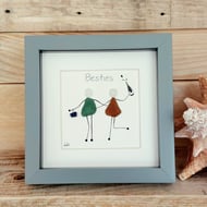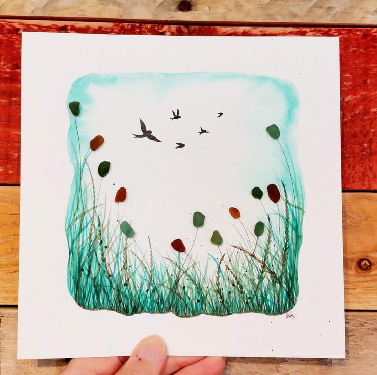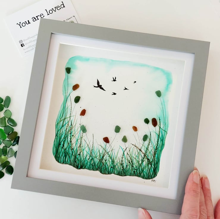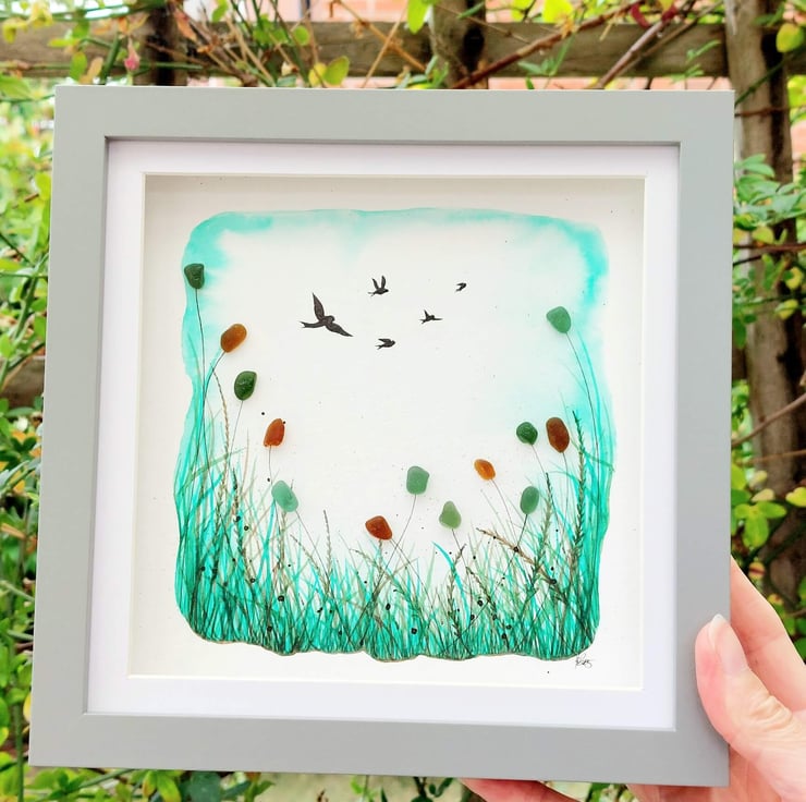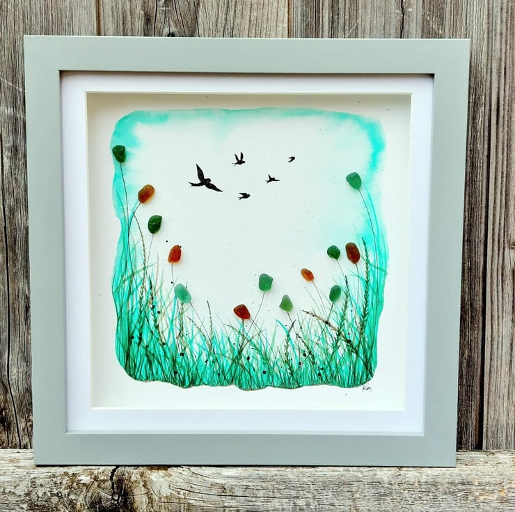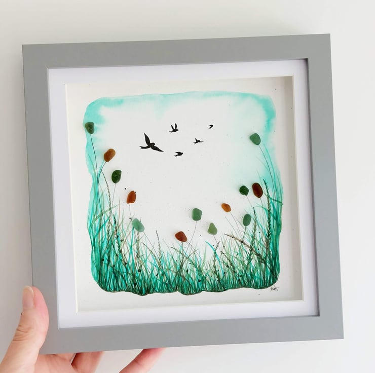 - This original artwork has been framed using a 20cm grey frame and mount. It is simple, elegant and makes use of beautiful, perfectly tumbled sea glass from Seaham.