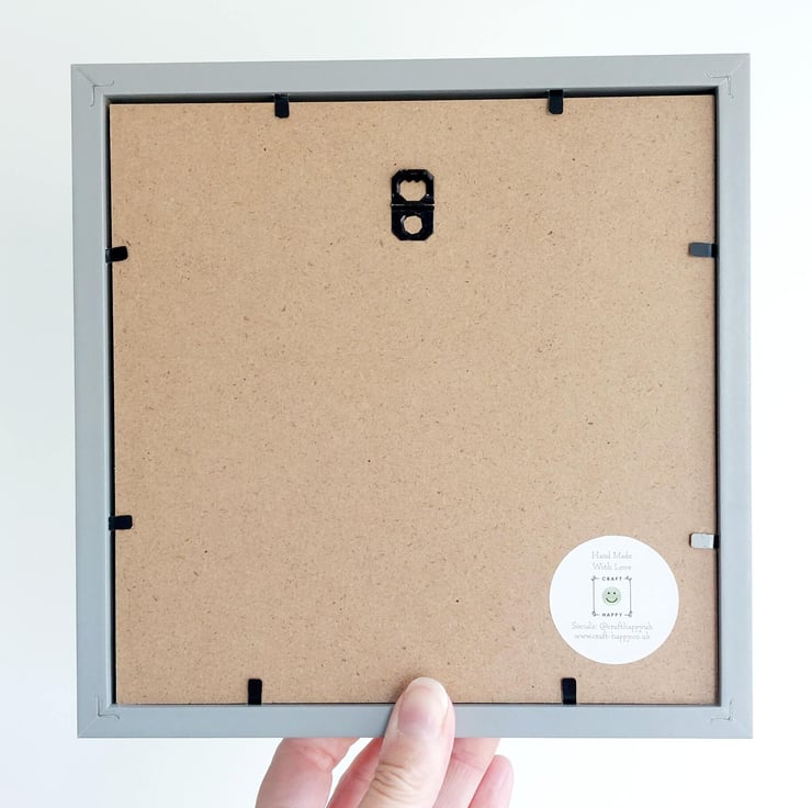 - The frame is 20cm square in grey with a mount. The aperture of the picture is 15cm and there is a hook on the reverse so you can hang it on the wall.