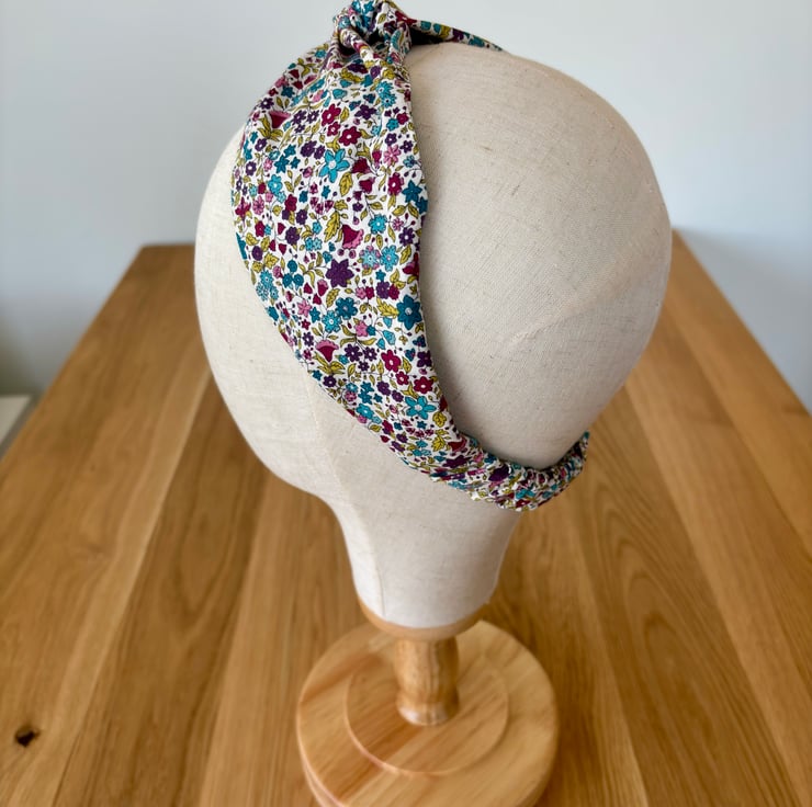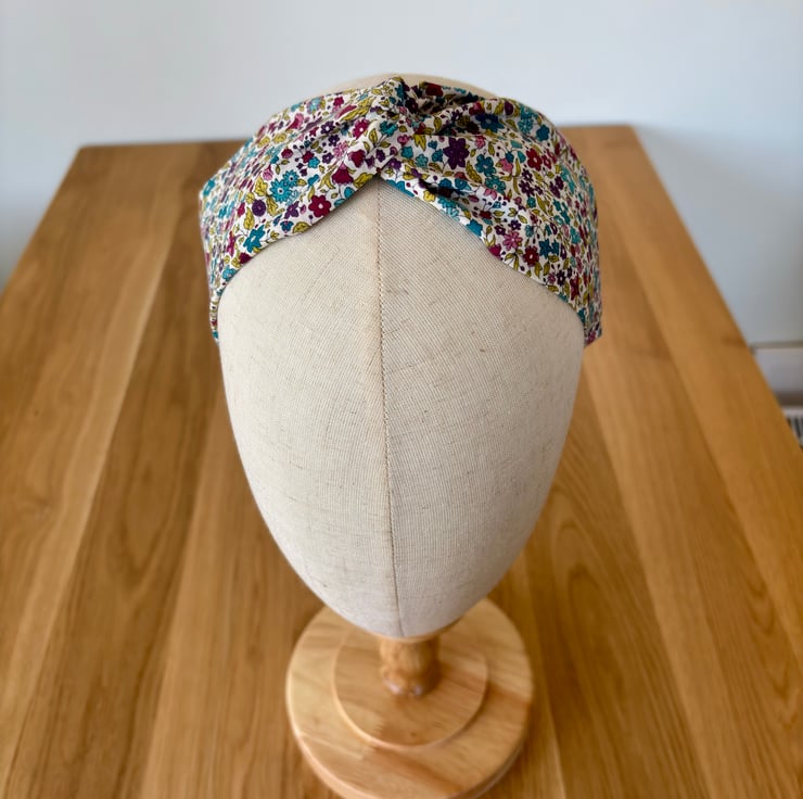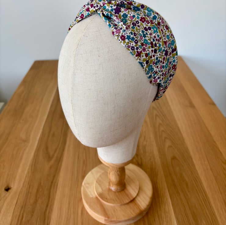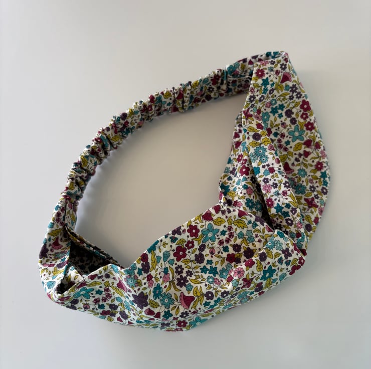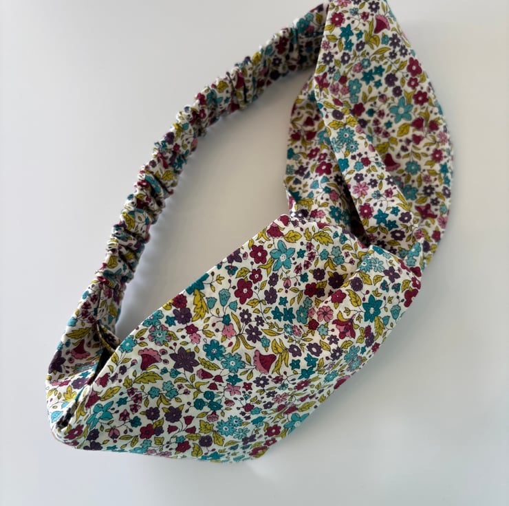 Handmade twist knot headband in soft 100% cotton, in a beautiful print of emerald green, wine, gold and dark purple flowers on a cream background.