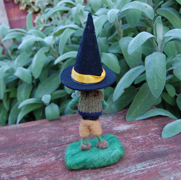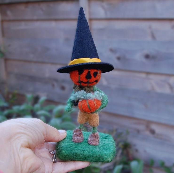 The Jack O Lantern figure is made using wire wrapped with wool yarn. Jack's head is wool fibres jabbed into shape by needle felting. I've added his mouth and eyes using a fine needle and black fibres. A witches hat sits on his head. His coat is a made using a piece of reclaimed wool fabric from a ladies jacket. Jack is attached to a wool base