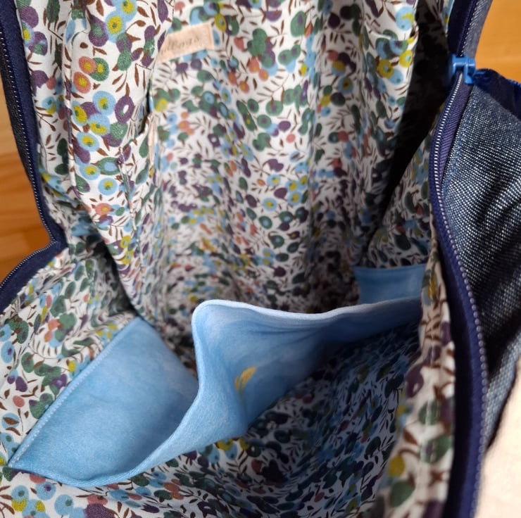 Lightweight navy denim backpack, with embroidered linen front panels and broderie anglais trim. Zipped front pocket, zipped main compartment lined in cotton print with inside pocket. Adjustable cotton webbing straps.