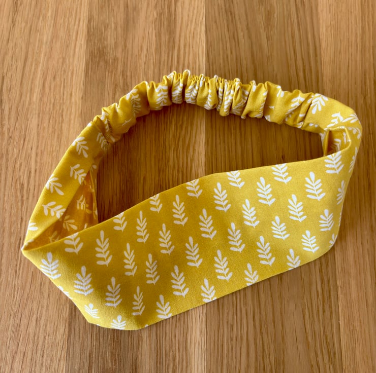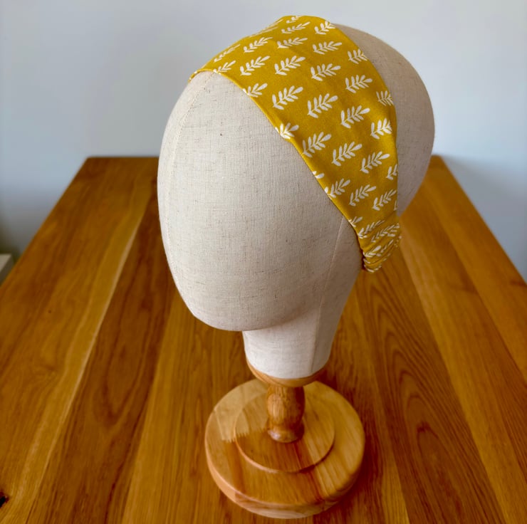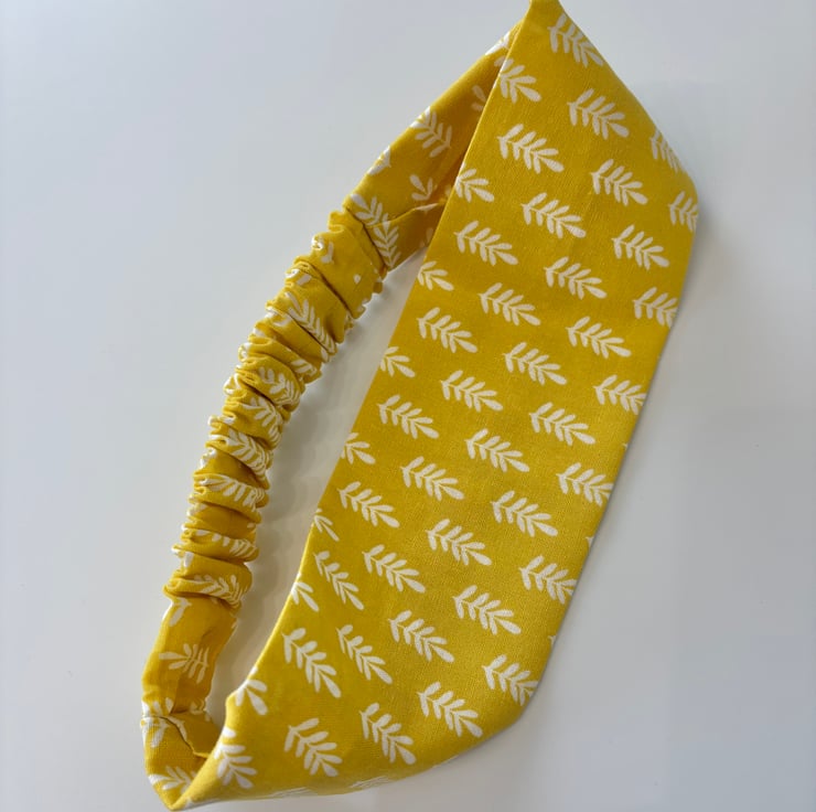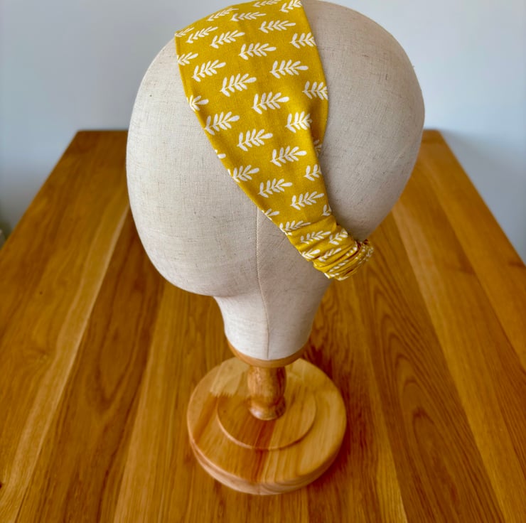 Handmade wide flat headband in soft 100% cotton, in a soft mustard yellow and white print.