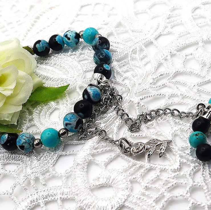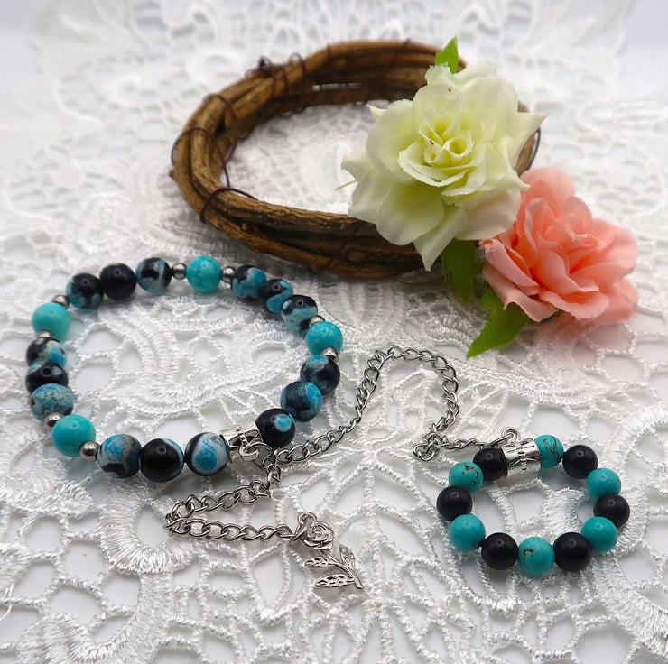 I have used 8mm Agate Beads with 4mm Stainless Steel spacer beads. For the Ring I have used 6mm Obsidian and Howlite Beads. All the Crystals compliment each other. The Charm is a Silver Plated Rose and the Chain is Stainless Steel which doesn't tarnish.