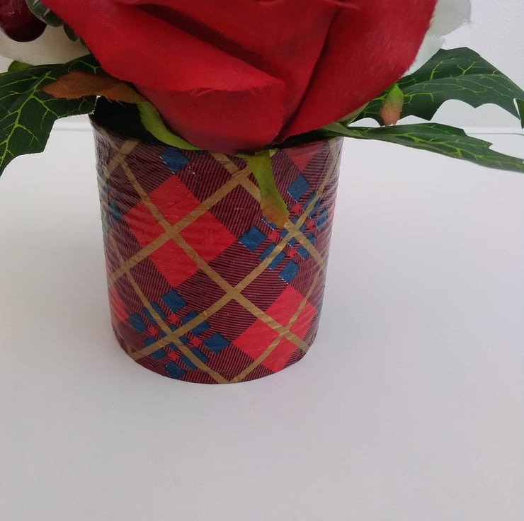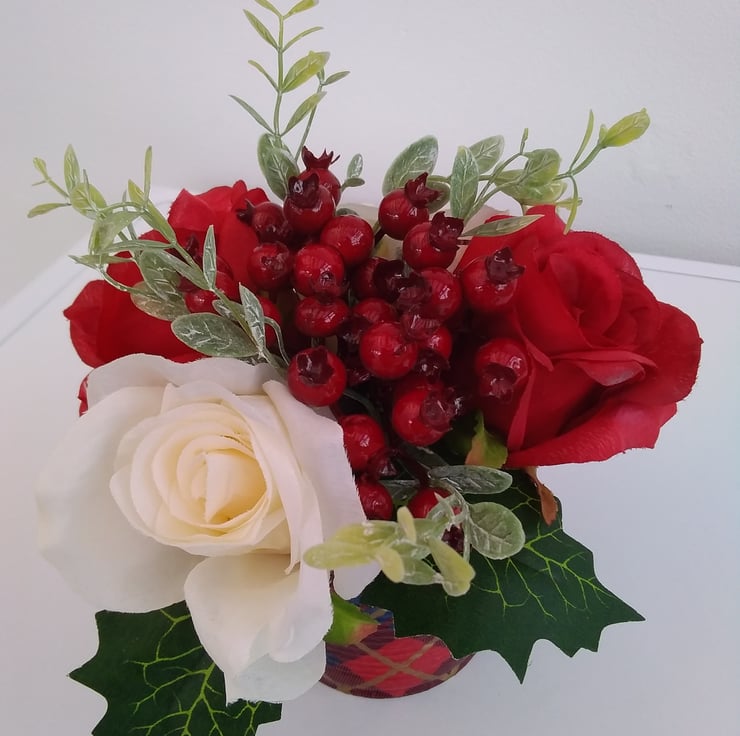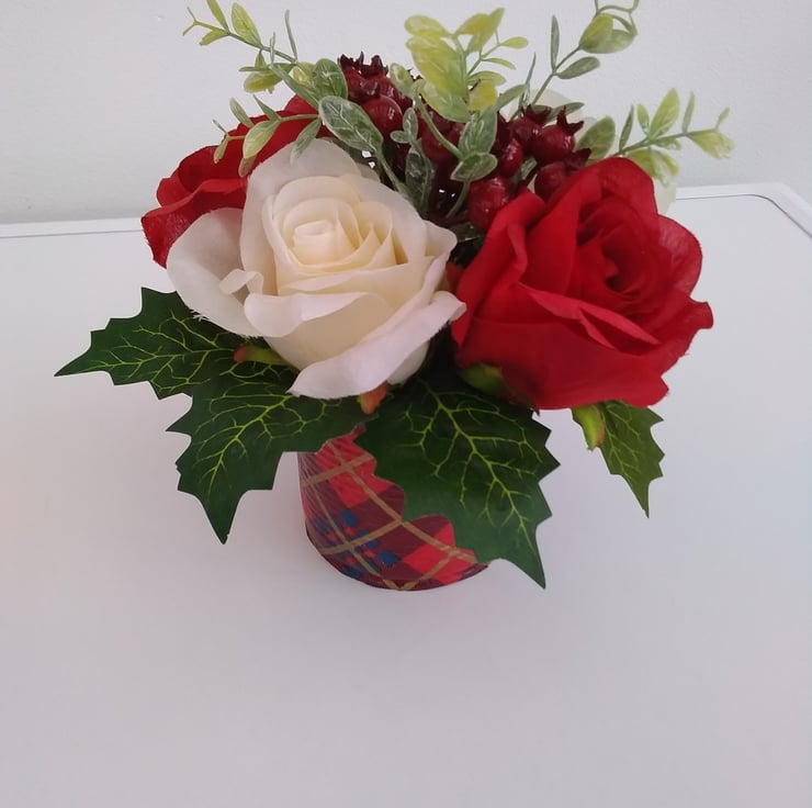 I’ve upcycled a tin using a traditional red tartan decoupage design and filled it with a beautiful mix of cream and red roses, glossy green foliage, and cheerful hawthorn berries. The result is a festive display that brings both warmth and sophistication to your seasonal décor.