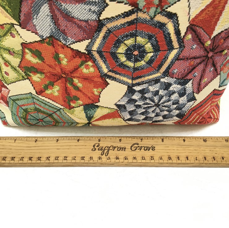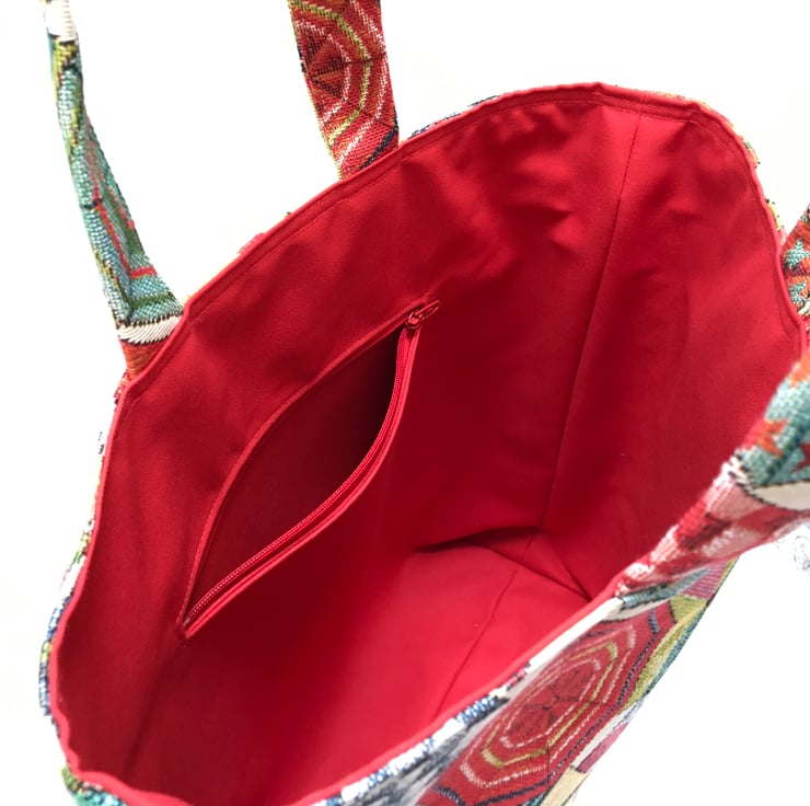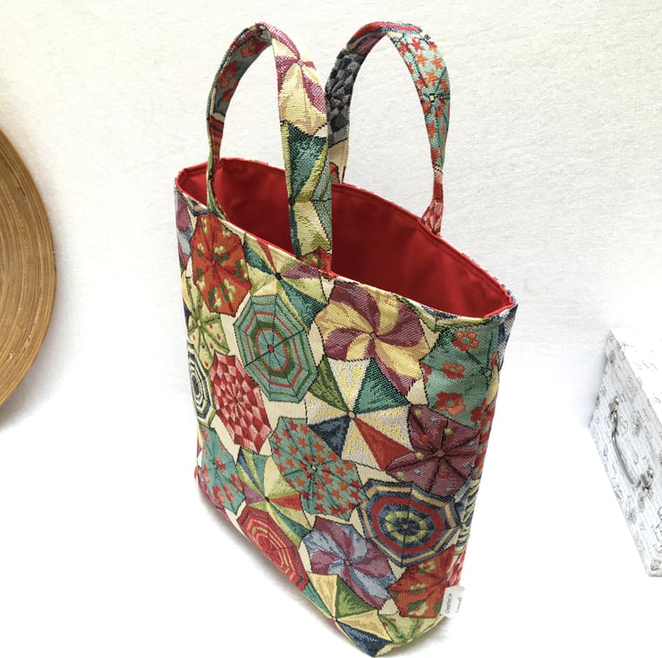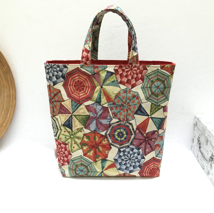 A colourful tapestry tote bag covered in umbrellas. Such a useful size tote. The lining is a bright red cotton and there is a handy zipped pocket inside.