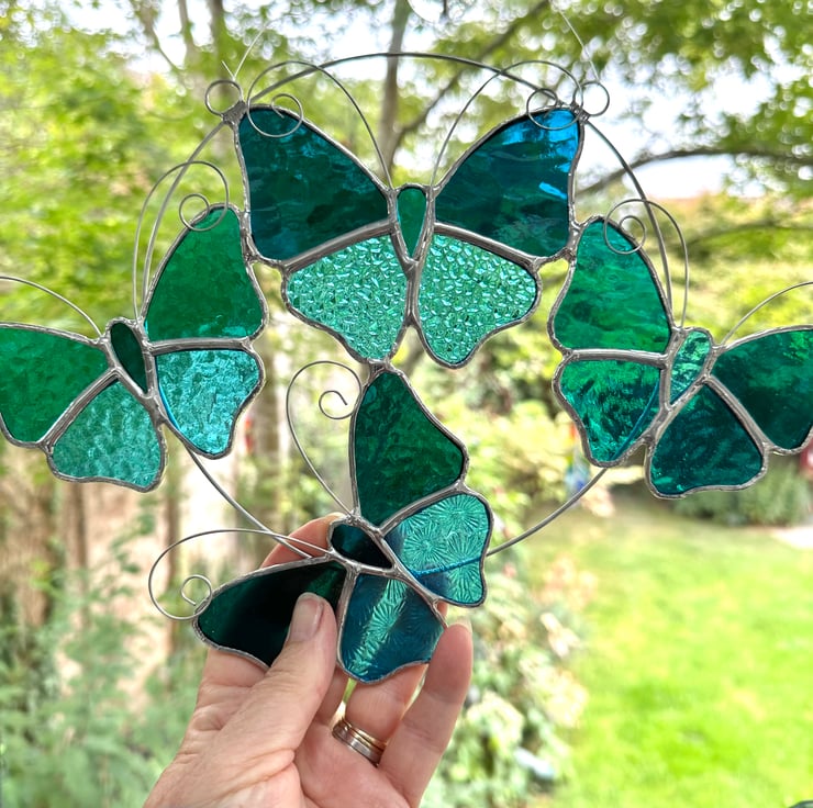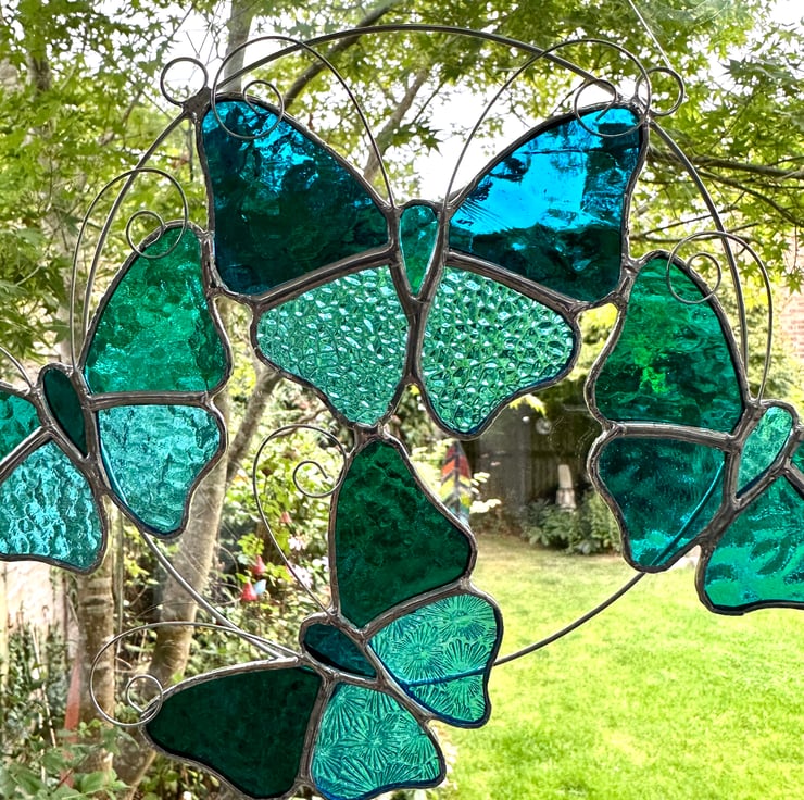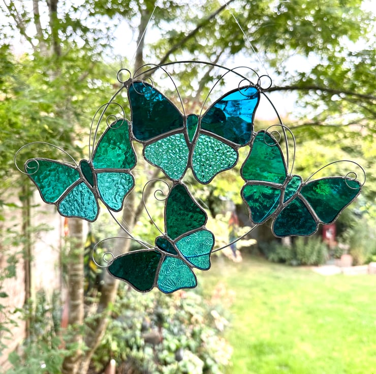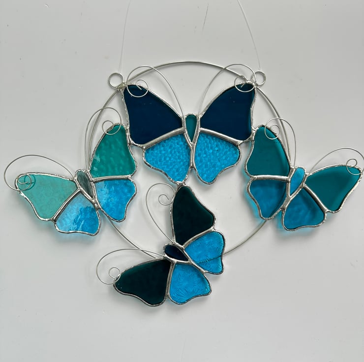 This suncatcher consists of four butterflies made from 4 different types of turquoise and teal stained glass.
