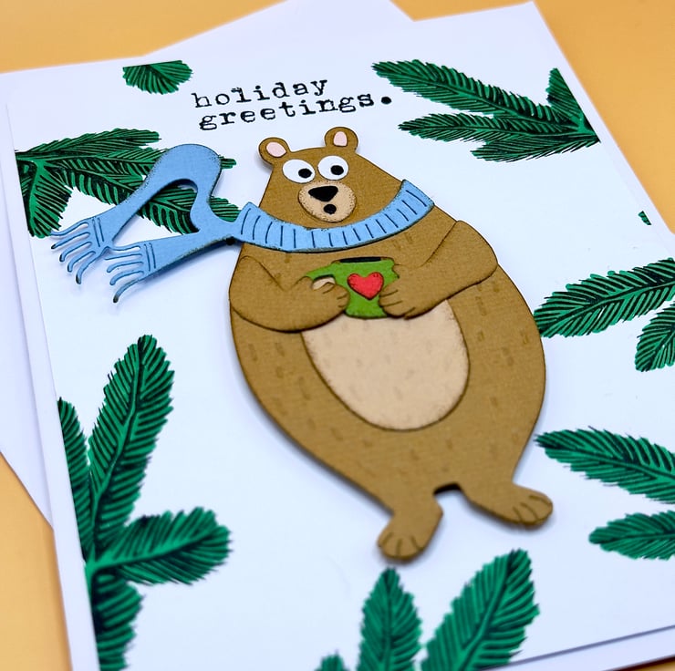 - Design: Hand-assembled die-cut bear, scarf, heart, and pine branches with stamped sentiment