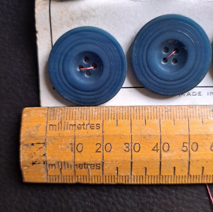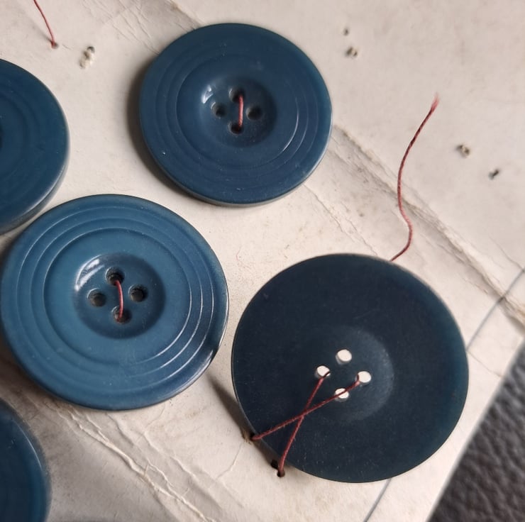 Nine big buttons in air force blue, just shy of 3cm in diameter. I've left them on their rather shabby old carboard to prove that they're nicely knocking on a bit. They could do with a spruce up. Ideal for a light coat or vintage dress perhaps. Let's use them up, people!
