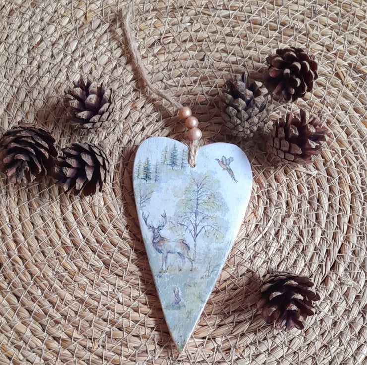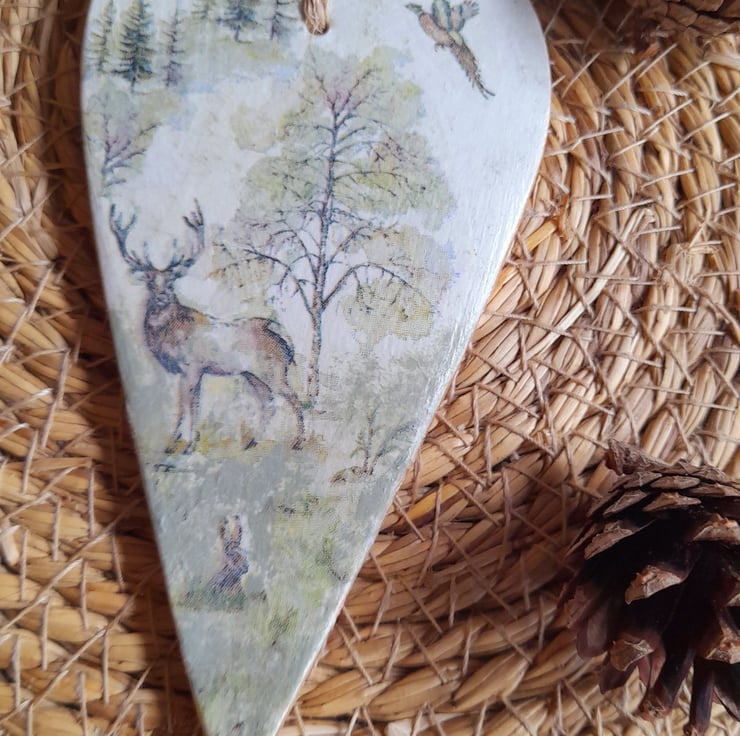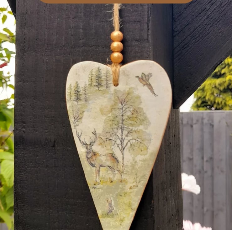 Handmade Clay heart decorated with a flourish of decoupage to feature this lovely woodland scene.